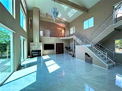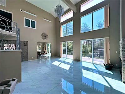 北側に浅間山、南側に八ヶ岳を望む「あさまテラス」別荘地内で、洗練された築浅デザイナーズハウスのご紹介です。 2台分のインナーガレージを備えた堂々たる外観の建物に入って驚くのは、天井高が7mもある大空間のリビング(約36畳)と、建具の細部まで拘られた意匠性の高さです。リビングとキッチン・ダイニングを合せると約56畳もの広さがあり、2階のギャラリーに置かれたピアノを奏でれば、コンサートホールへ様変わりします。2階には吹き抜けを挟んで、主寝室とゲストルームがあり、主寝室には大きな窓が印象的なラグジュアリーな浴室、ゲストルームのバルコニーからは軽井沢のシンボル「浅間山」を望みます。 建物の南東側に広々とした芝庭は、150cmのフェンスが設置されているので、ワンちゃんが自由に走り回れるドックランとしても活用可能です。 軽井沢の豊かな自然を感じながら特別な時間をお過ごしください。 ご見学お待ちしております。