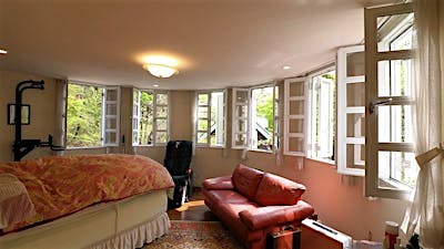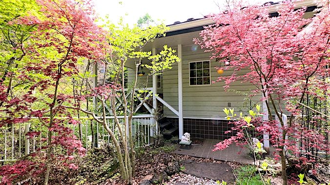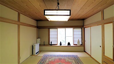 A uniquely shaped villa stands in a quiet spot on National Route 18 towards the foot of Mount Hariyama. The over 1,500m² site is planted with many trees, including flowers and autumn leaves, allowing you to feel the changing of the seasons, and there is also a covered carport for two cars at the back of the site. Inside the building, the living space is based on the same white as the exterior walls, creating a contrast with the wooden-paneled living and dining area, creating an extraordinary atmosphere. Be sure to check out this villa, which is full of resort atmosphere, with a covered sun deck overlooking the lush forest and a bathroom sauna!
