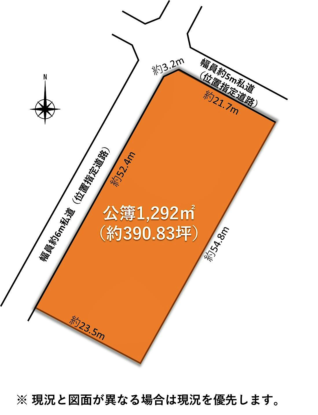 幅員約6m私道に北西側にて約52.4m接道 幅員約5m私道に北東側にて約21.7m接道