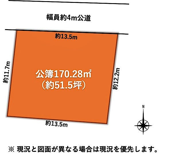 北側幅員約4m公道に約13.5m接道