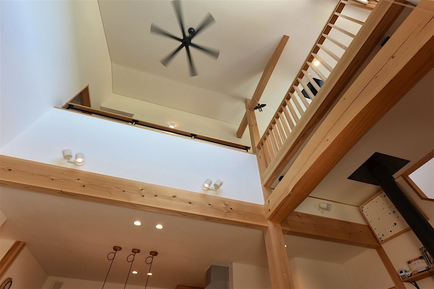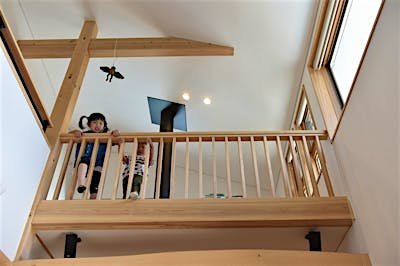 2階の共有スペースは、吹き抜けに漂うような感覚の「浮き床」。変化のある空間が楽しい。