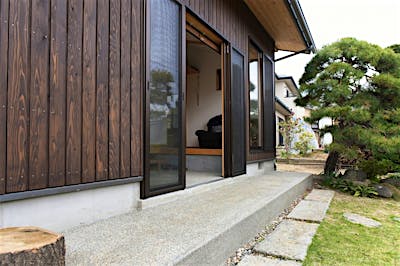 母屋の一部を解体し、横並びに新築。落ち着いた外観デザインが周囲の建物や歴史ある庭と調和する。