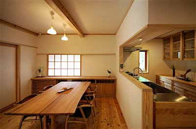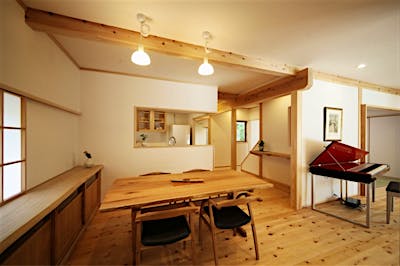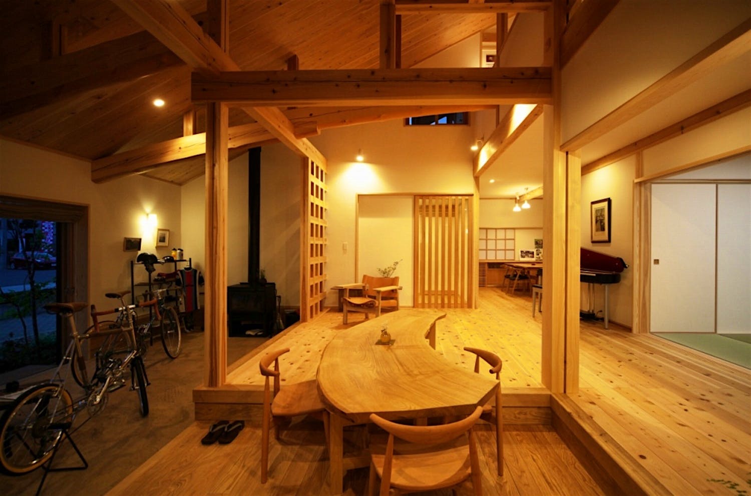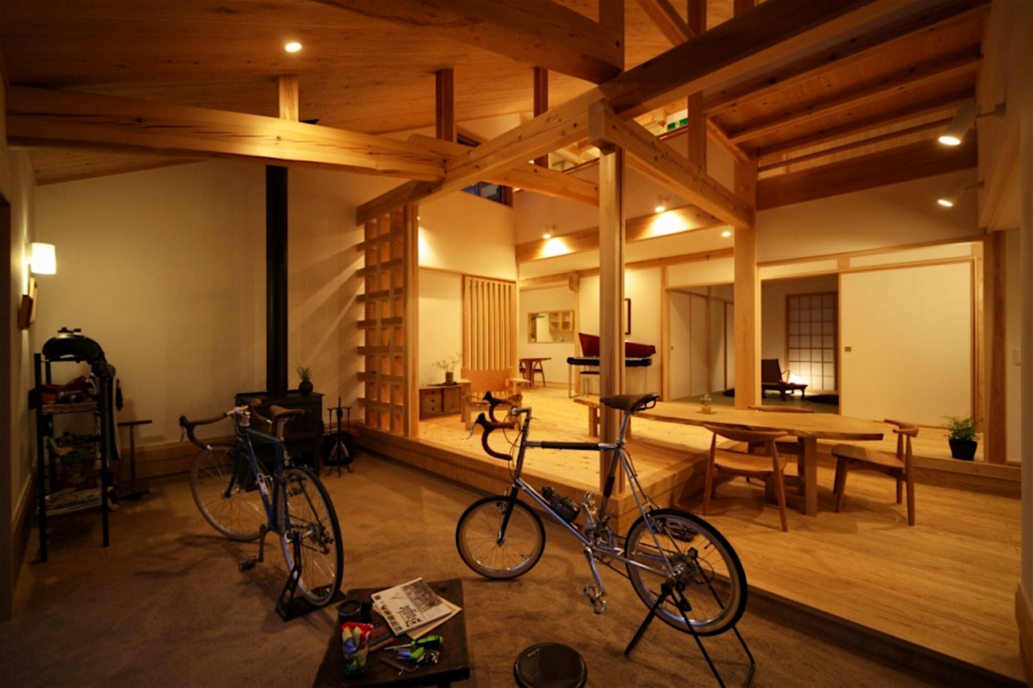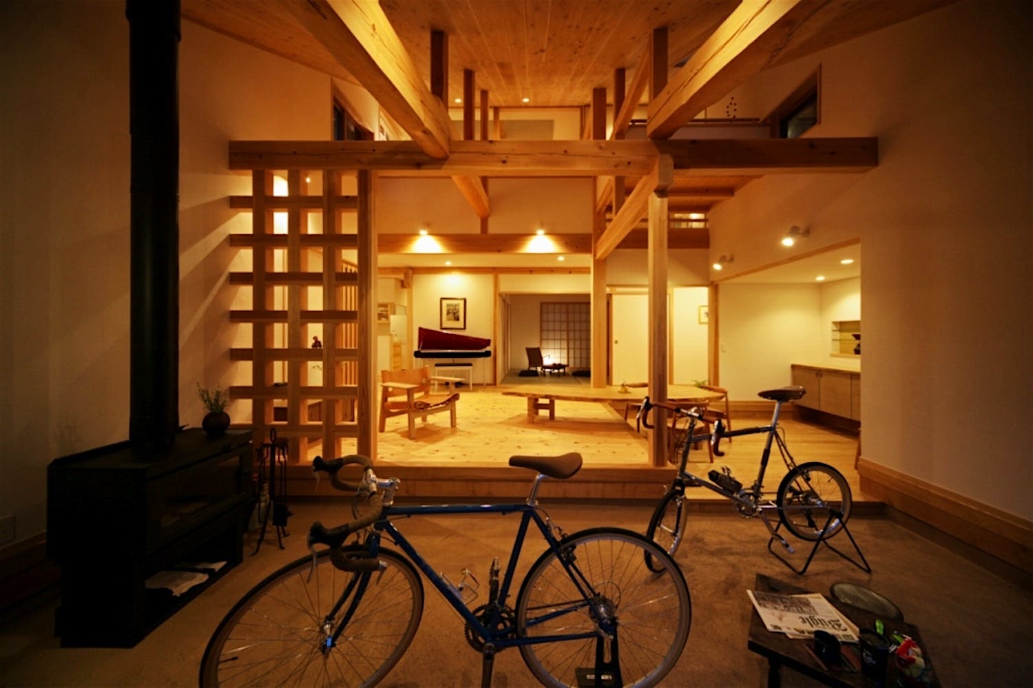 美しさ際立つ木組みの架構と、大家族にふさわしい広々とした土間サロン