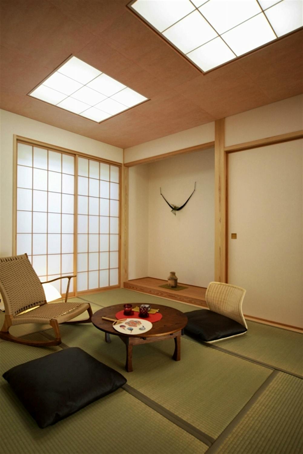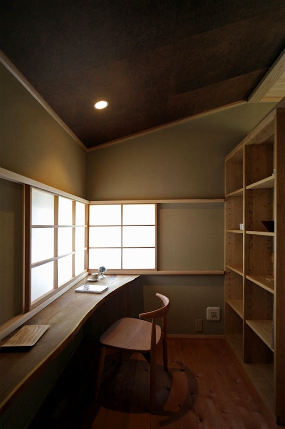 寝室奥の書斎コーナーは、床に柿渋を塗り、天井は和紙で仕上げた。落ち着きある大人の空間で、創作活動や読書に勤しむのにふさわしい。