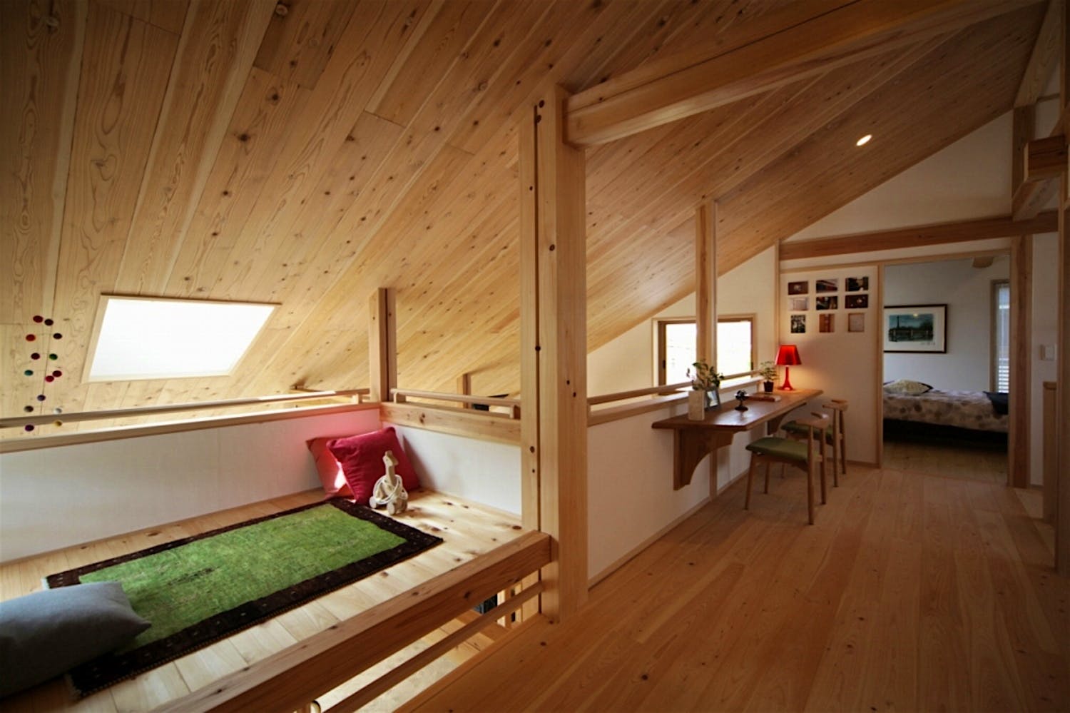 吹抜けにただようような「浮き床」スペースは、子どもたちのとっておきの遊び場に。天井は低いが、天窓と地窓で光をたっぷり浴びる空間に。