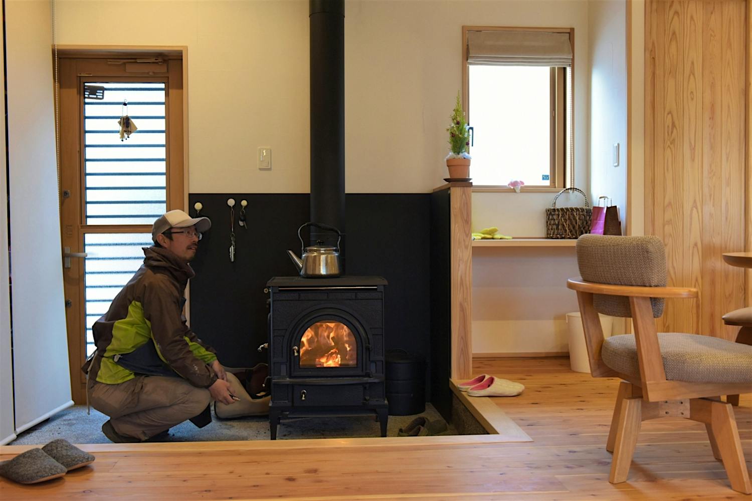 薪ストーブは土間に配置した。勝手口とも繋がり、薪運びもラクラク。灰や木端も土間なら気にならない。