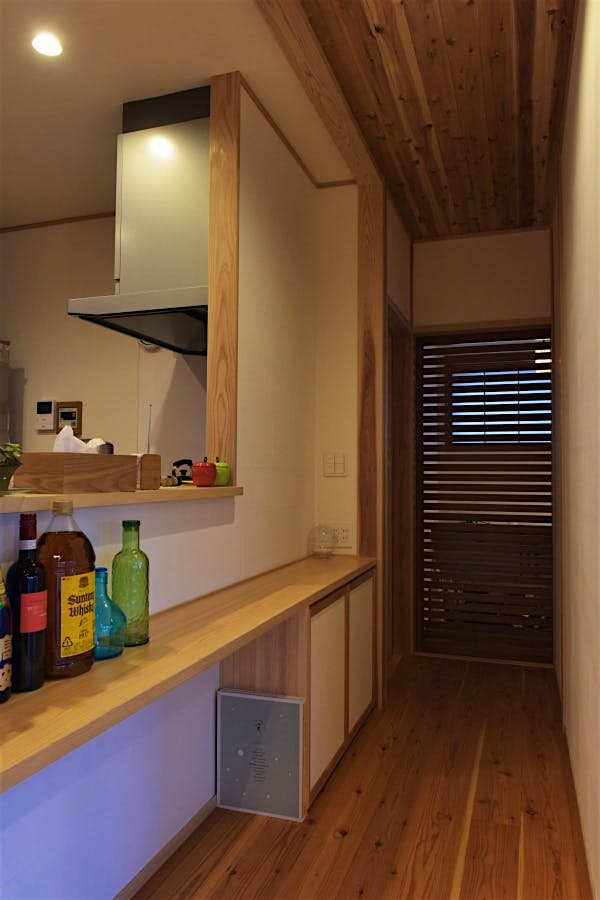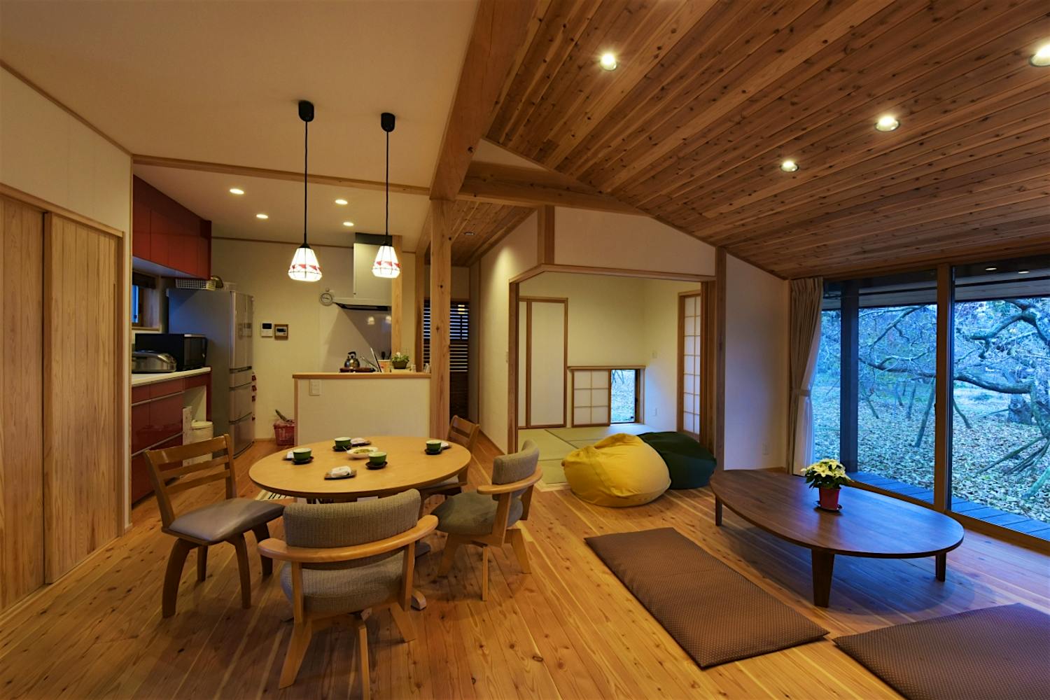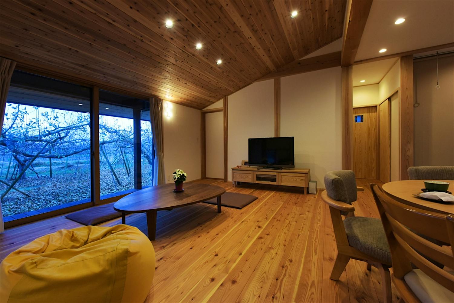 平屋建ての天井は斜天井にし、広がりを感じる空間に。杉の板張り天井が木のぬくもりを感じさせる。