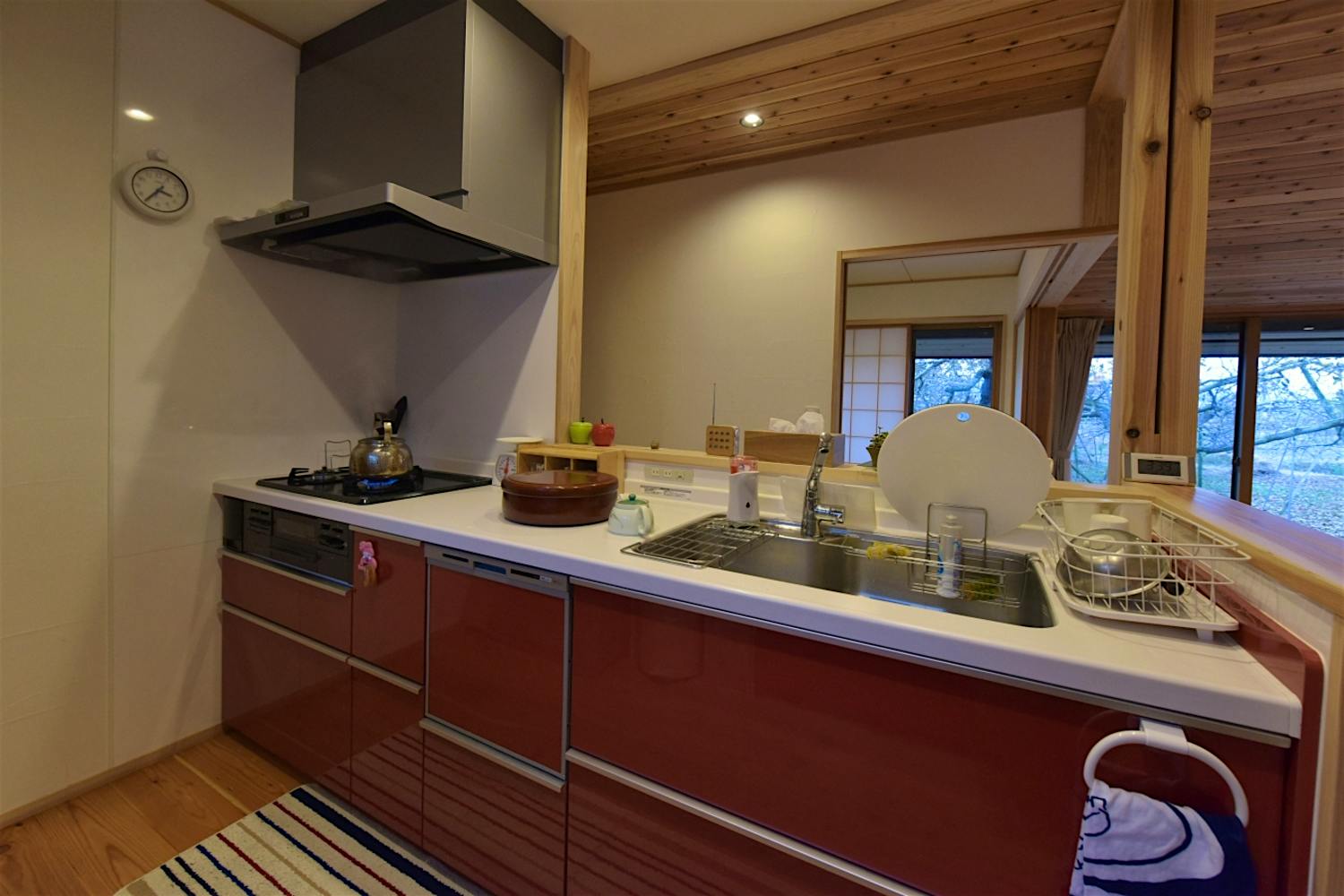 キッチンはアクセントカラーの赤。無垢の素材感の中で目を引くキッチンに。