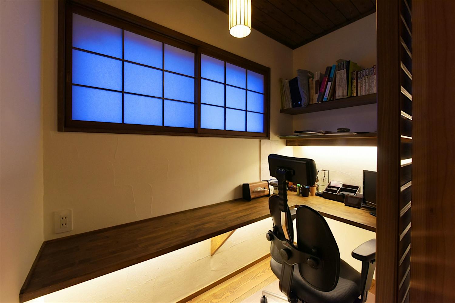 ご主人様こだわりの書斎コーナー。シックな色味のカウンターや建具、間接照明も大人の空間を演出する。