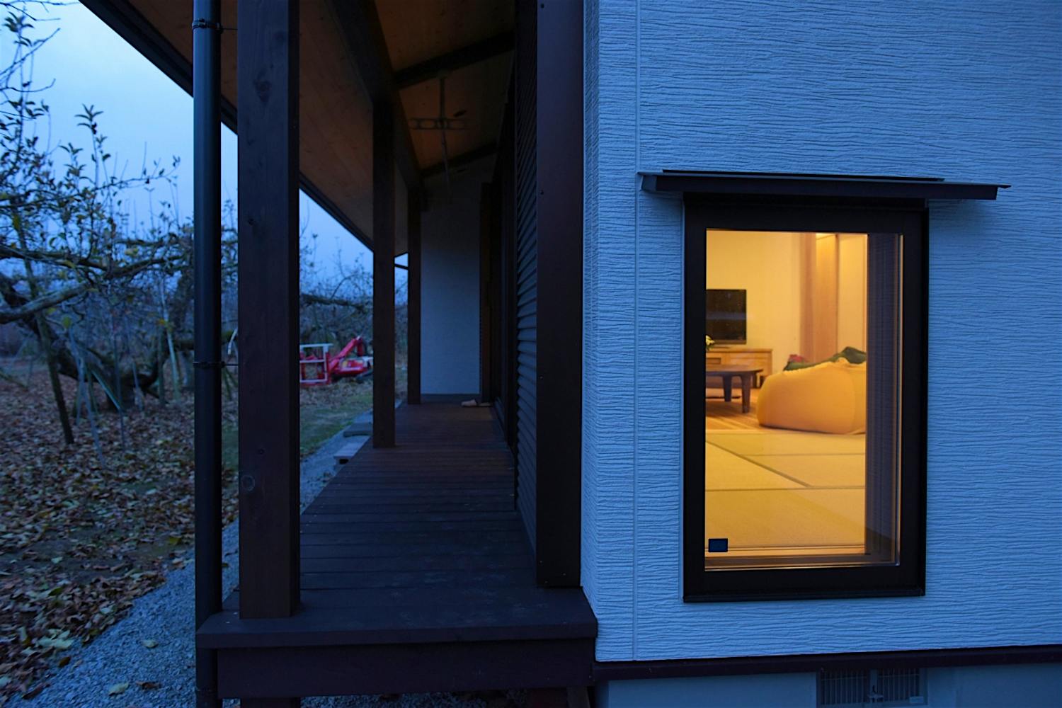 りんご畑に面する濡れ縁。畑作業の合間に腰かけ、一服できる。