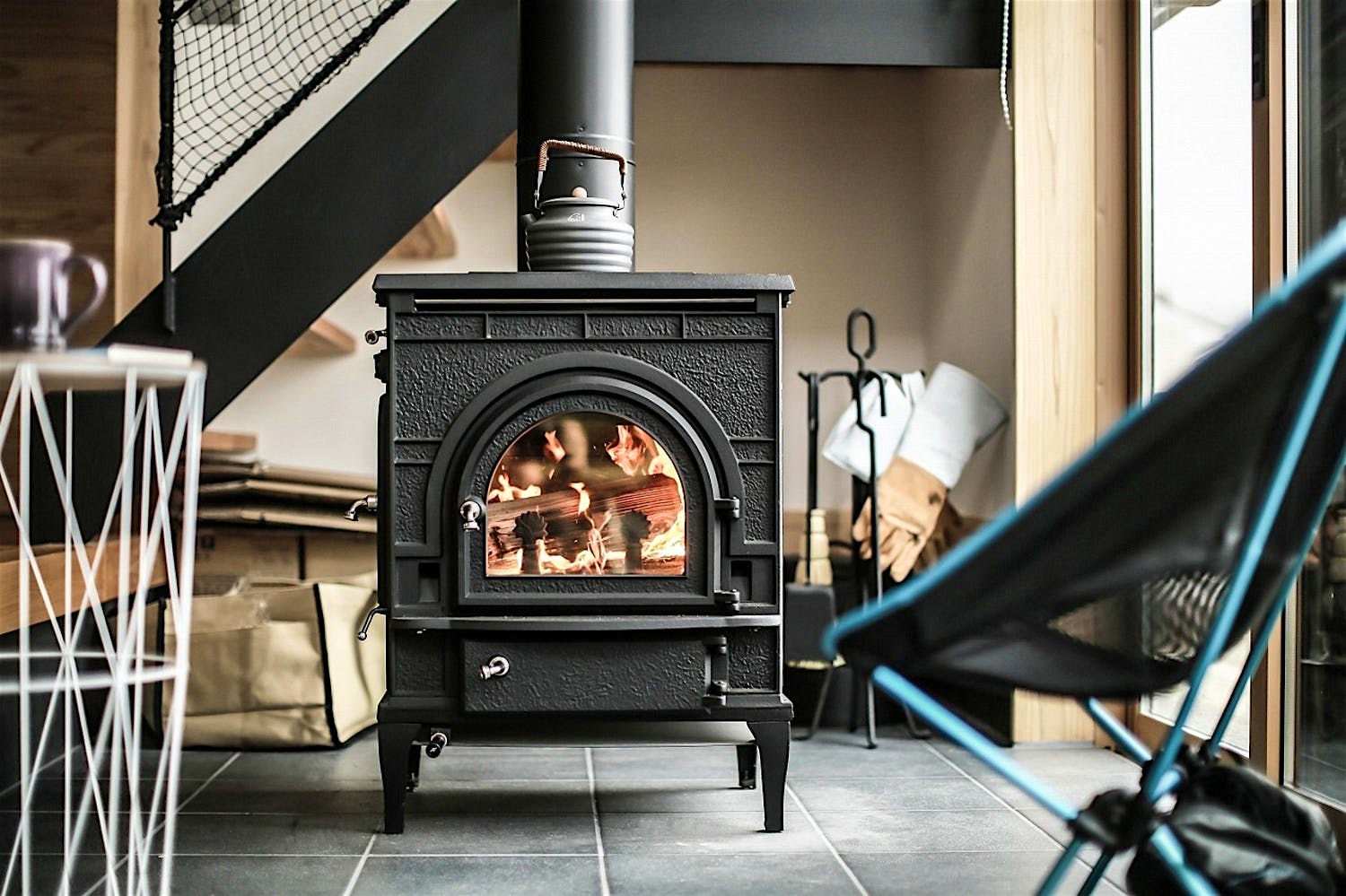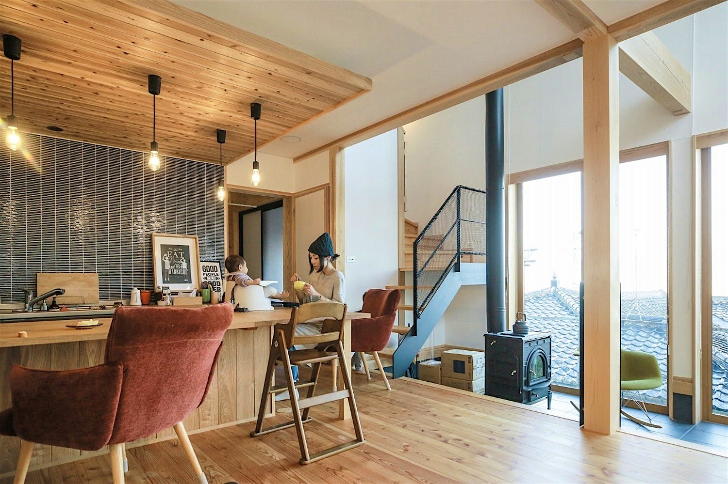 壁付けキッチン。後ろを振り向けばカウンターテーブルなので、作業や配膳がしやすい。壁のタイルもアクセントになり、空間を引き締めている。