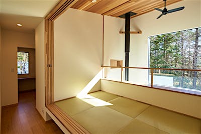 敷地内の樹木伐採から携わり、全てがまっさらな状態からオーナーと創り上げたこの家。計画当初から微動だにしなかった要望がビルトインガレージだった。他のものは色々右往左往したりしたのだがこれを組み込む事だけは終始一貫していた。そうなると自然とビルトインガレージが計画の中心となり、出来上がったものは家の中5ヶ所からクルマを愛でることの出来る家だ。 総2階片流れという超シンプル外観形状のこの家。この中には超高天井のビルトインガレージ有り、吹き抜けに伸びる長い煙突有り、客間にも使用出来る小上がり的な遊び心溢れる和室有り、他にも盛り沢山だ。外観形状からは想像も出来ない内部の創り込み。これも建築屋の醍醐味ではないだろうか。