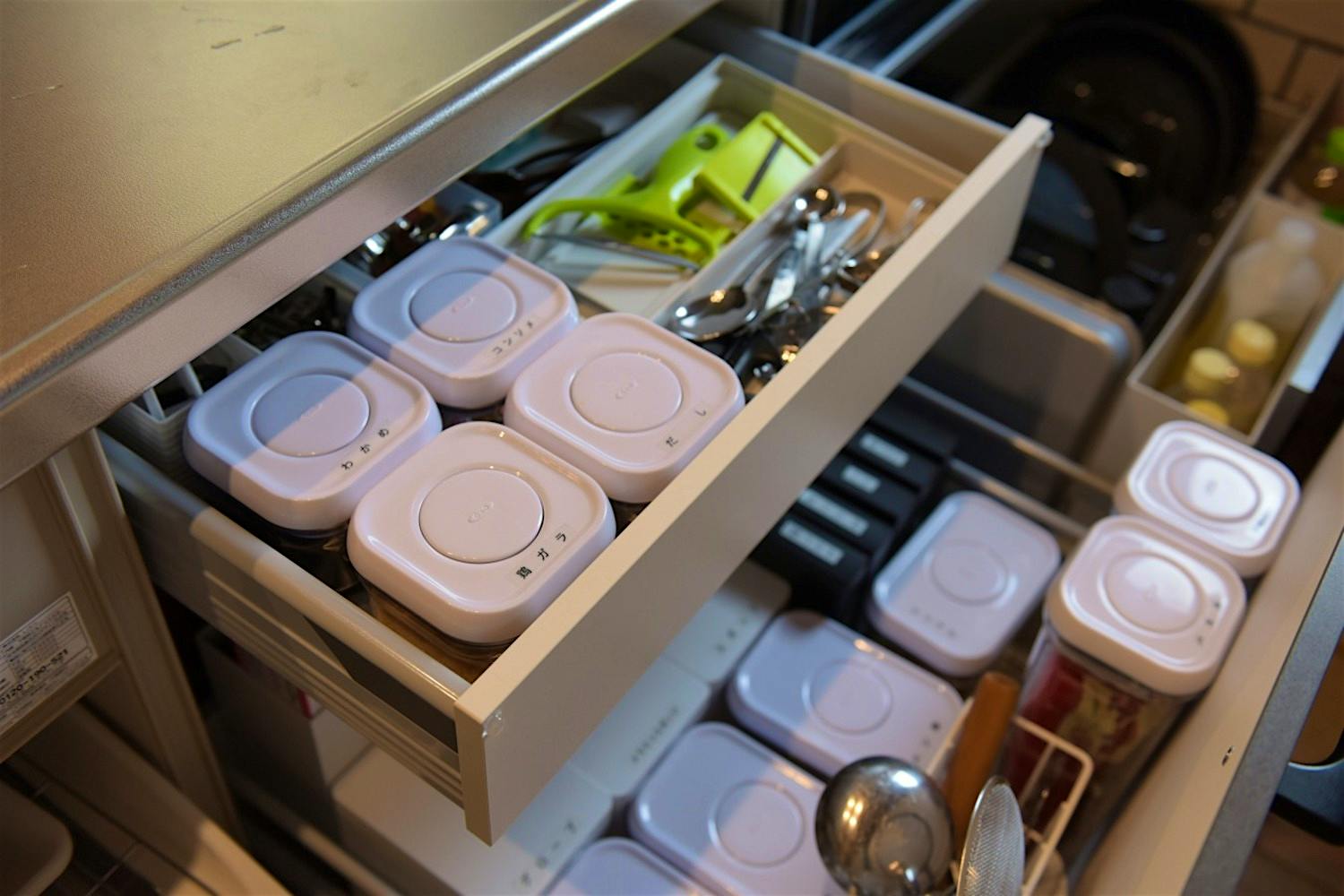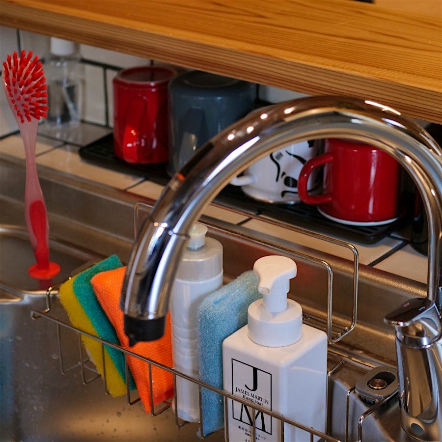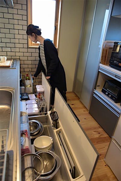 奥様のこだわりポイントのひとつ。シンク前にちょっとした収納スペースを配置することで、リビング側にごちゃごちゃしたものが見えずにスッキリできます。普段よく使うコップを置いておくのも便利です!
