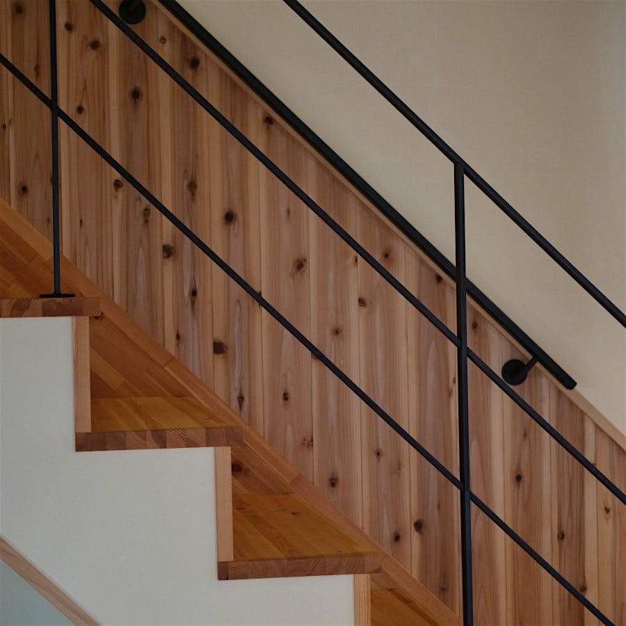 照明器具やアイアン手すりはブラックで統一したコーディネート。ダイニングテーブル天板はモンキーパット。