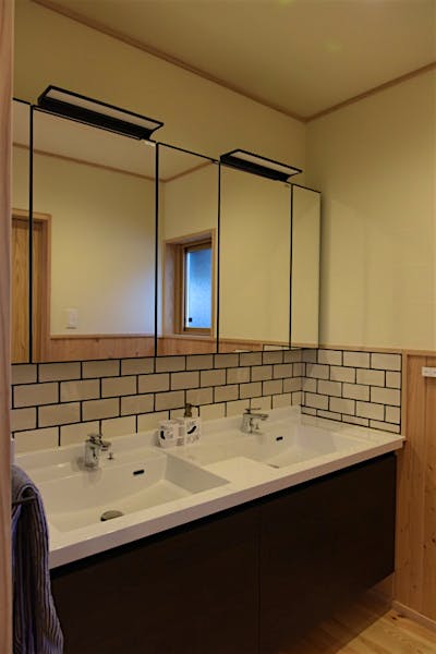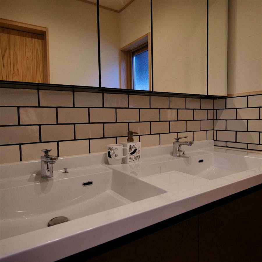 洗面台の壁とキッチンには揃いのタイルをコーディネイトした。二つの洗面台は娘さんと二人並んで化粧をする、という奥様の夢から。
