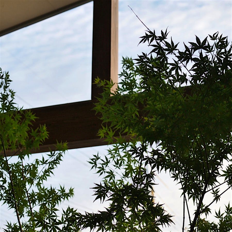 お母様のリビングからは、地窓を介して中庭を望む。若夫婦世帯と真向いの位置ながら、地窓と高窓で視線をずらして気兼ねなく景色を眺められる、プランニングの妙。