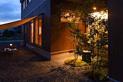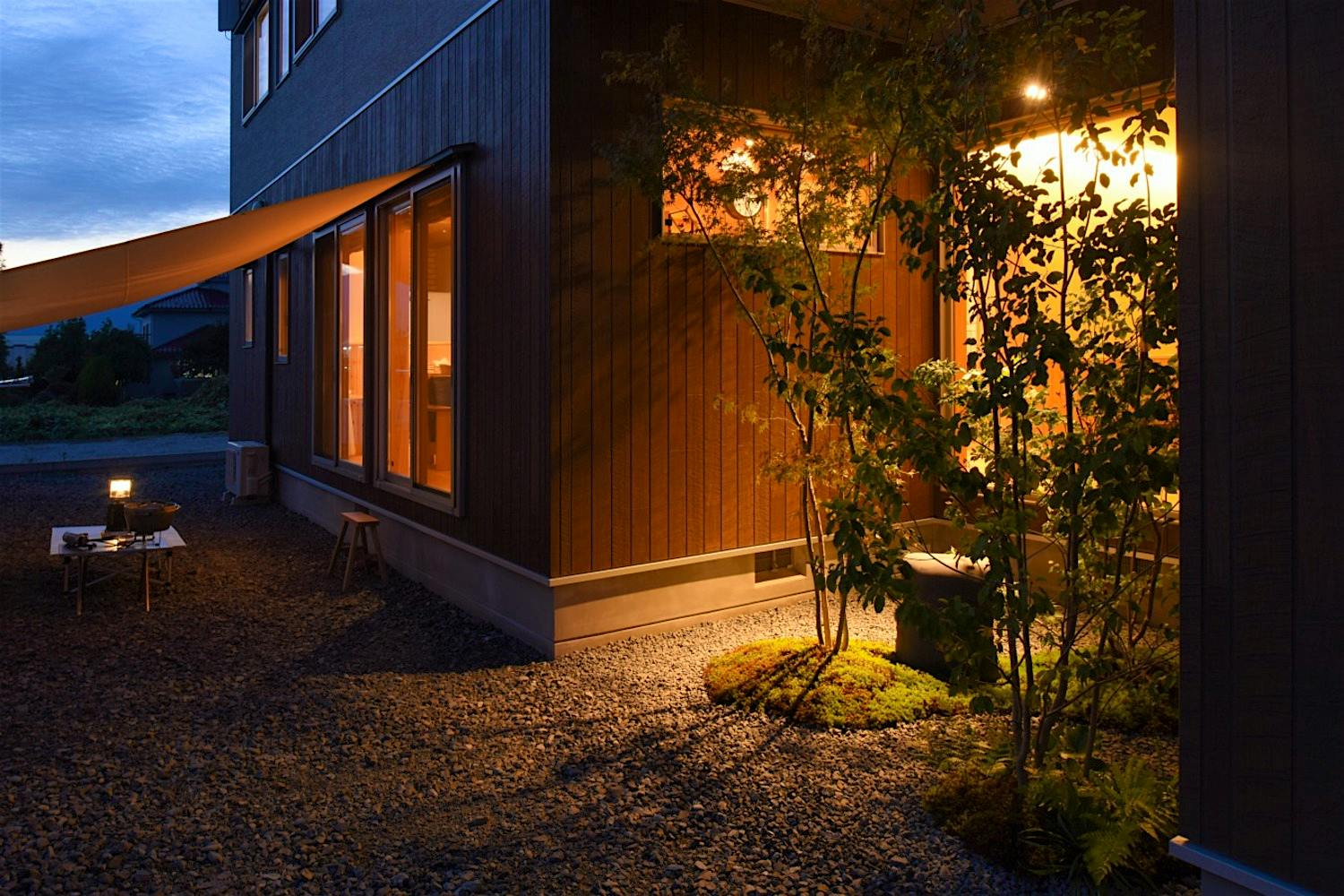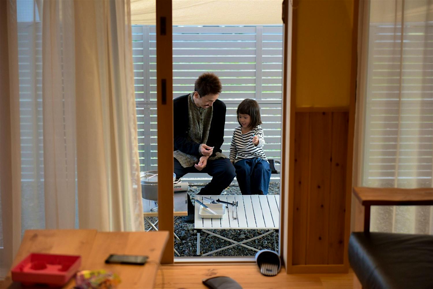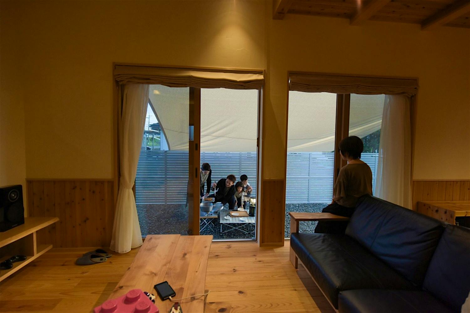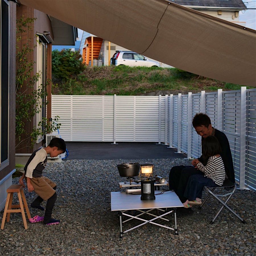 南庭でおうちグランピング。タープがあれば軒がなくても簡単に居心地のいい空間を作れる。