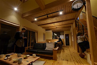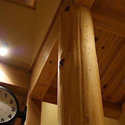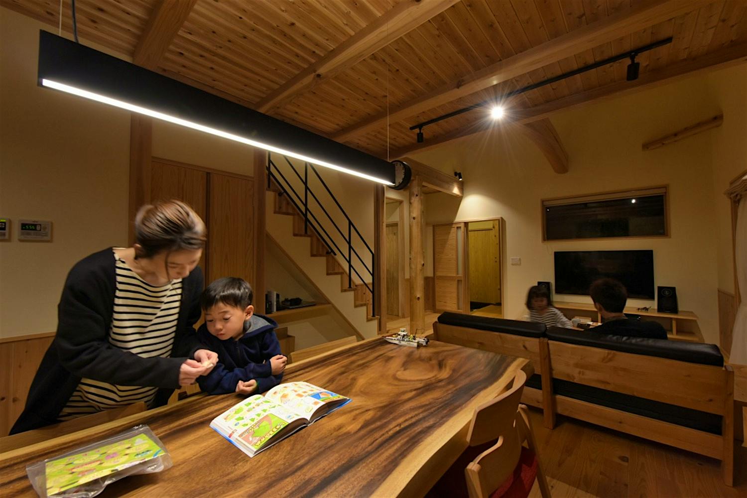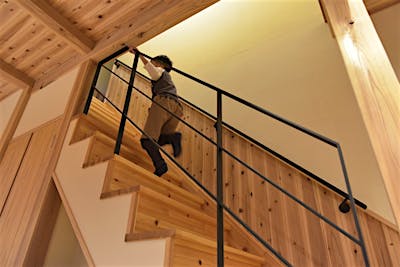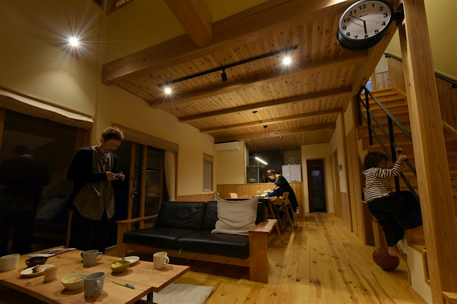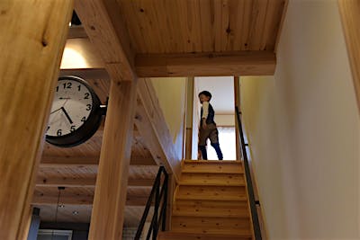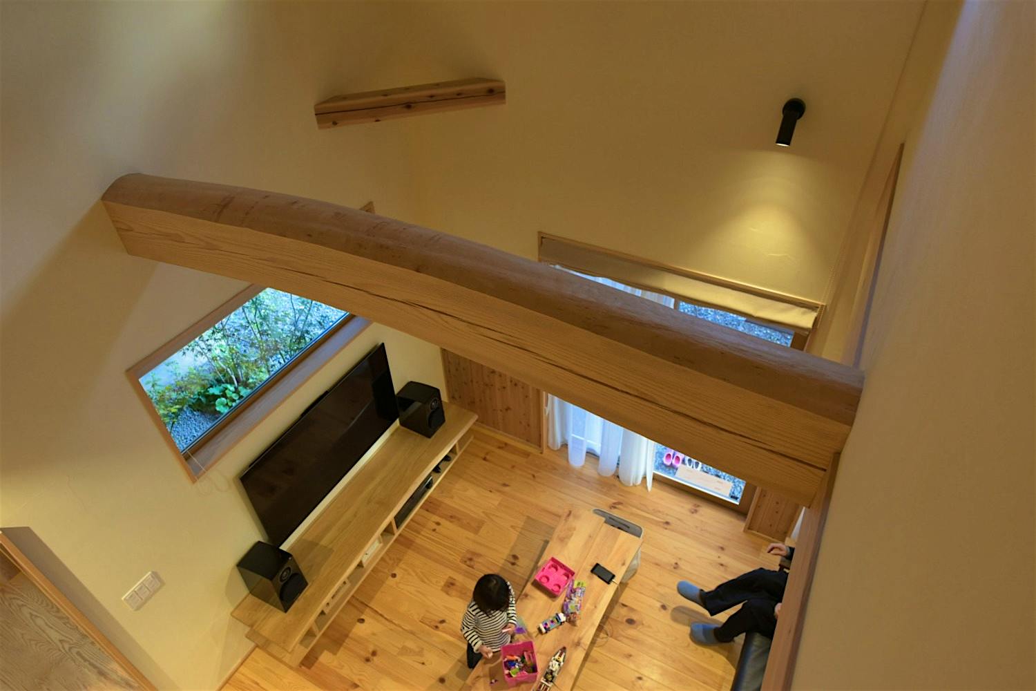 リビング上の吹き抜けには選木ツアーでお選びになった赤松の太鼓梁。ふとした時に、建築前の思い出が思い起こされる。