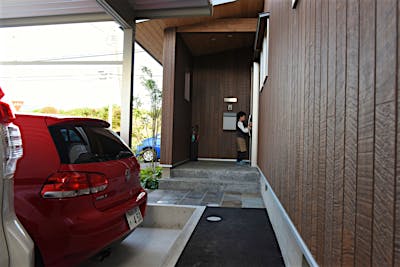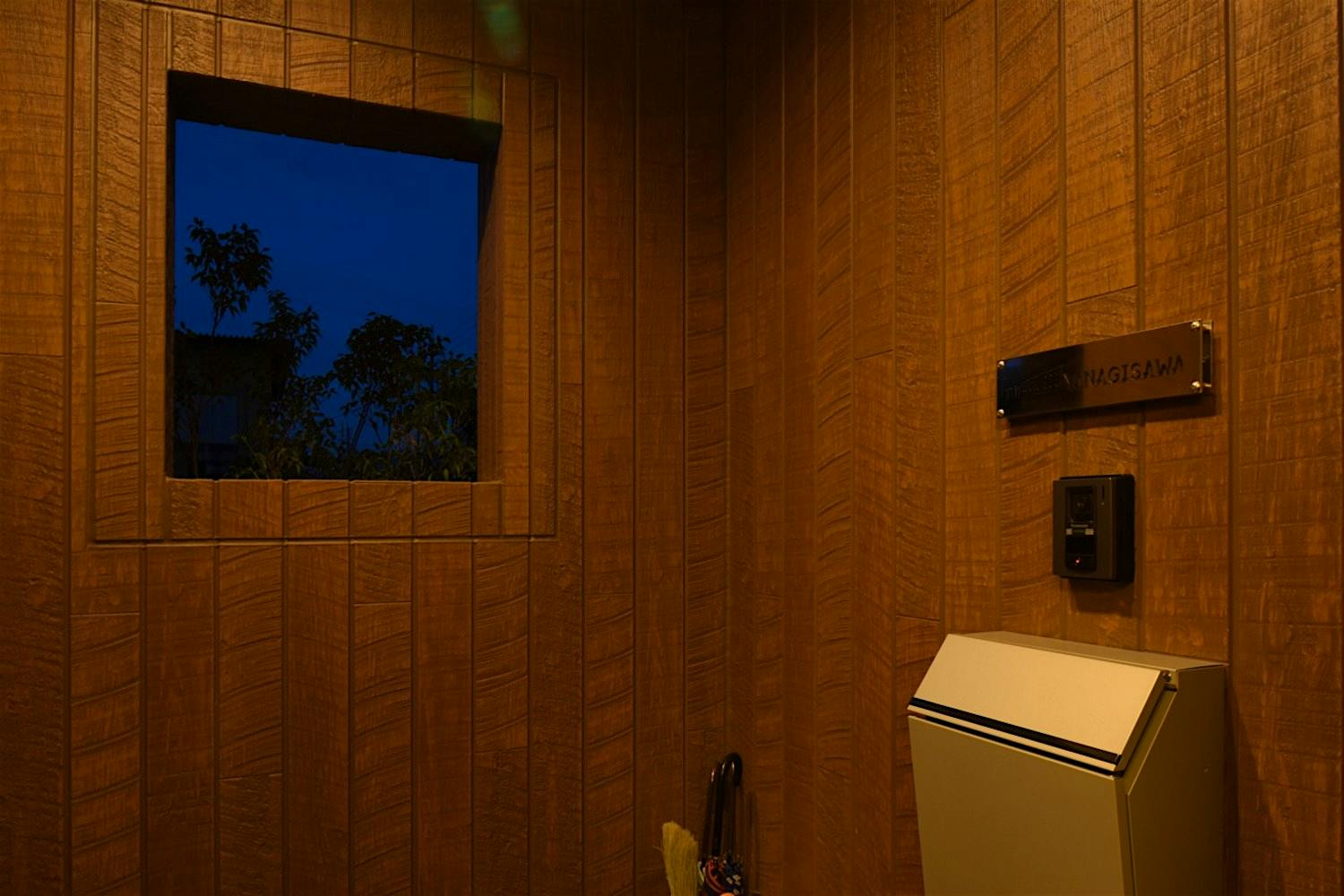 北側の玄関は交差点とも近く、停車中の車からの目線を防ぐため玄関ポーチは三面を壁にした。