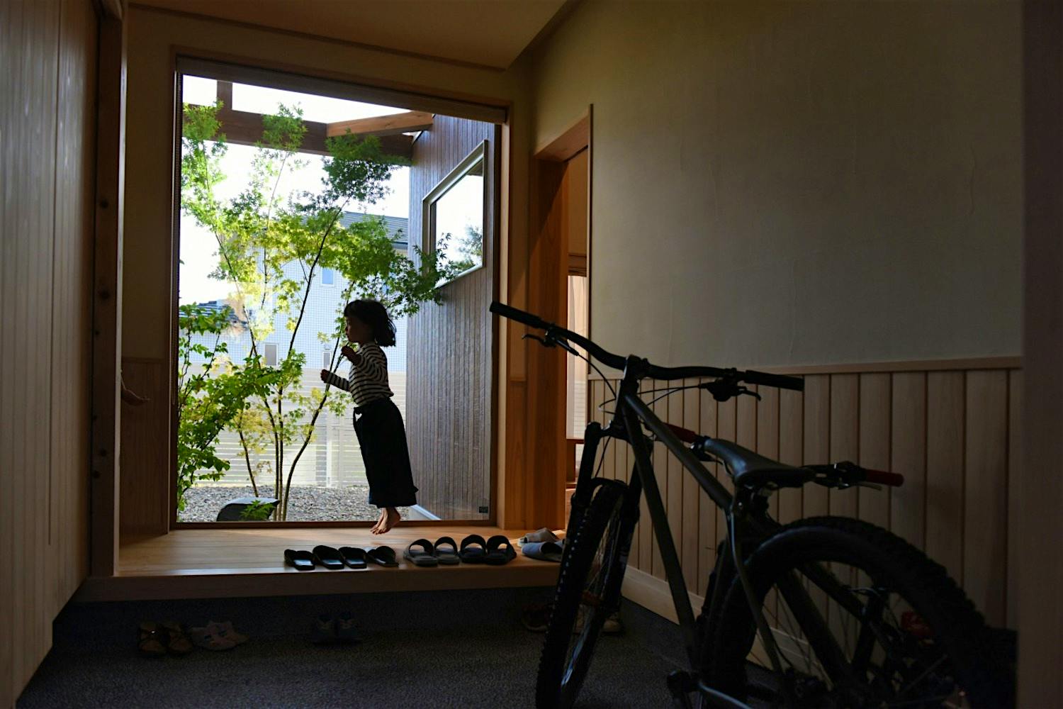 玄関正面には大きなピクチャーウィンドウを設け、シンボリックな中庭を眺められる。住まいの顔に相応しい空間設計。