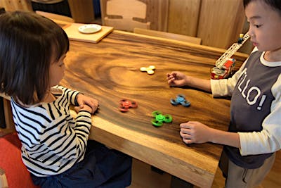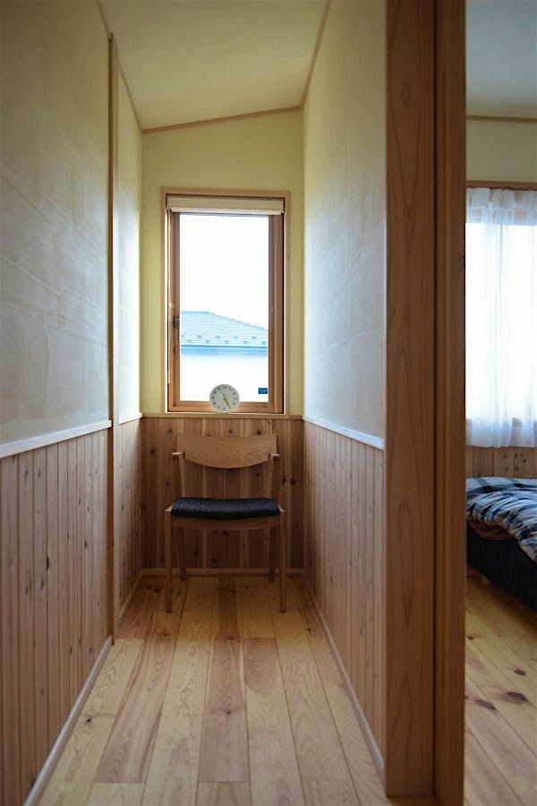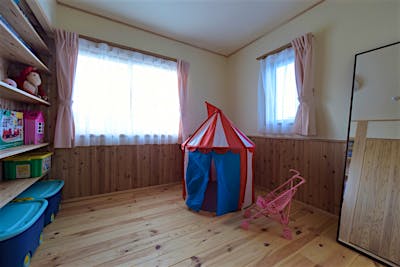 息子さんのお部屋。床材は長野県産の赤松。造り付けの本棚には教科書と彼のお気に入りのオモチャが飾られている。