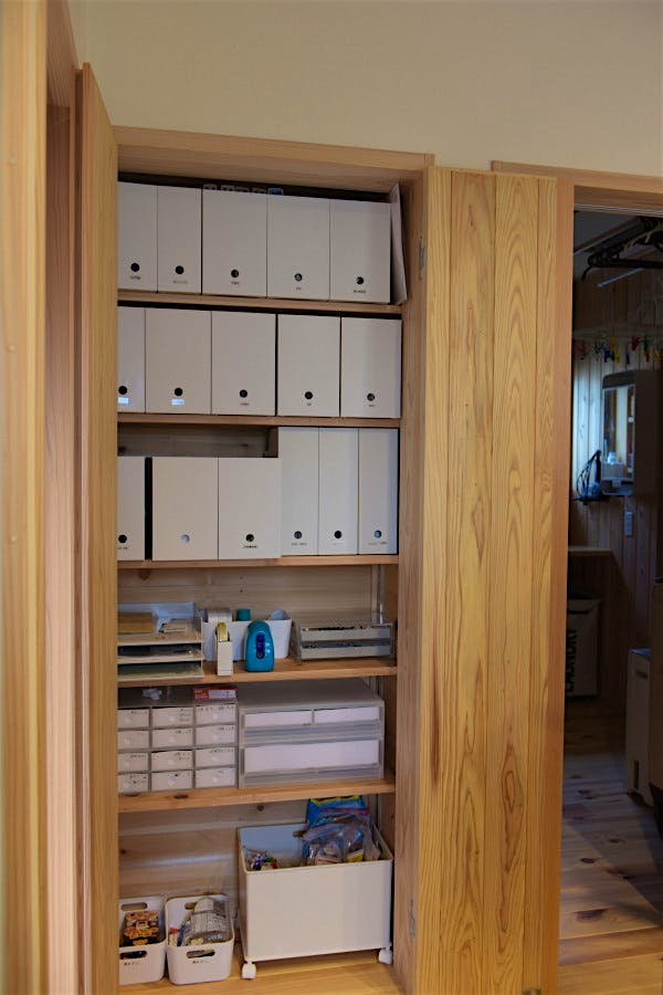 奥様渾身の力作、シンデレラフィット収納、その②よく見るとそれぞれの収納ボックスにはテプラが貼られ、中身や誰の物か一目でわかるようになっている。一手間が住みよい暮らしを生んでいる。