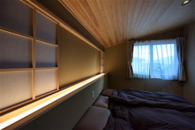 吹抜けとつながった寝室。左右対称に空気取り用の建具を配置。その建具を障子にし、通した敷居を活かして手前には間接照明をプランニング。内装の壁にはあえて京壁を使用し、ムーディーな寝室を提案しました。間接照明の明かりが吹き抜け側にもさりげなく灯るのも狙っています。