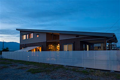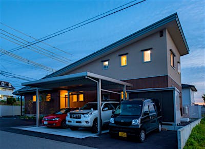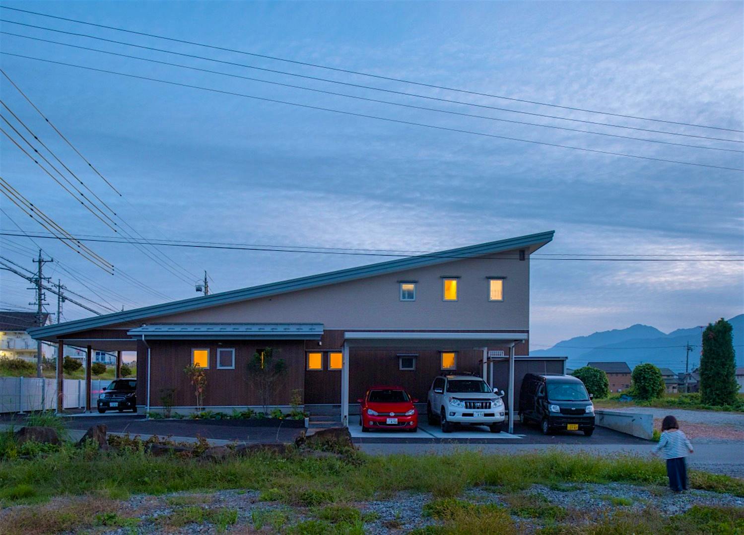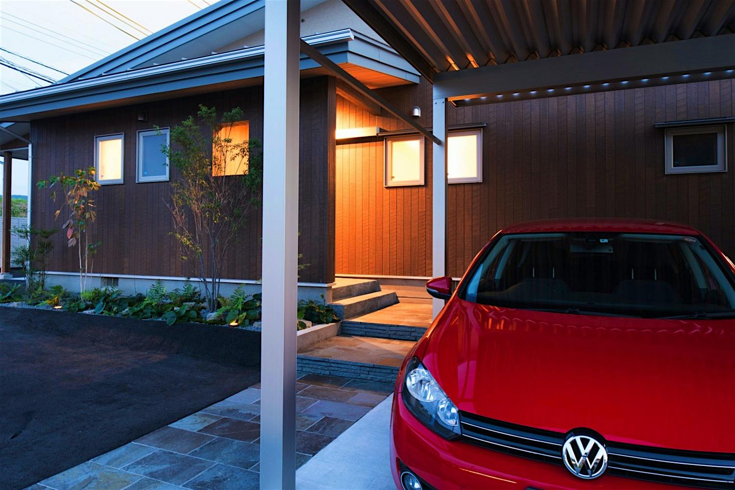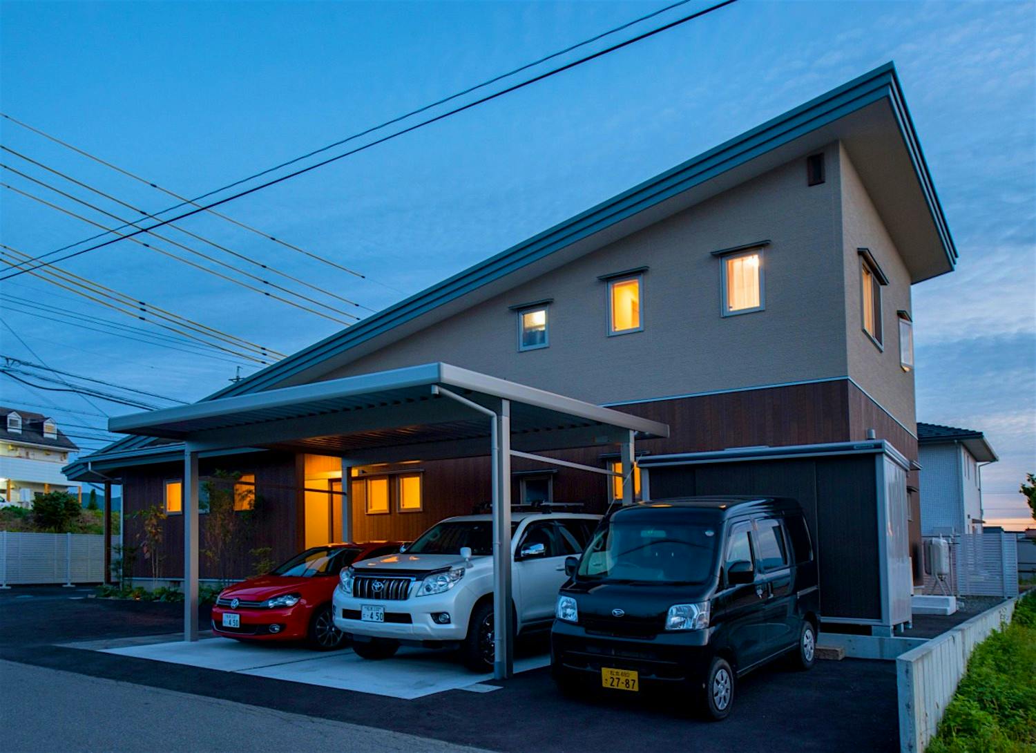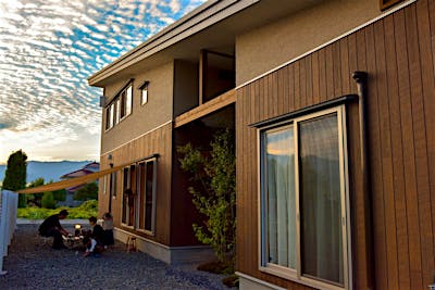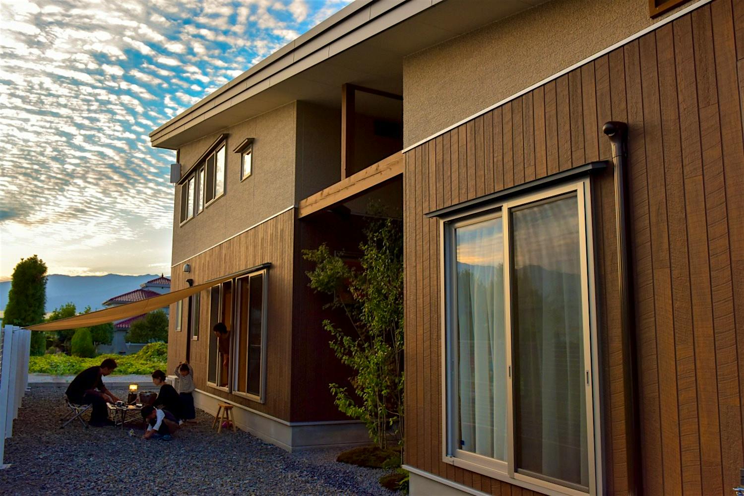 『メンテナンスがラクなように』とのご主人からのご希望もあり、外壁には化粧サイディングを使用。落ち着いたカラーの外壁仕上げとし、同じ片流れの諏訪展示場とは雰囲気を変えています。内装の男らしさを外装にも…。