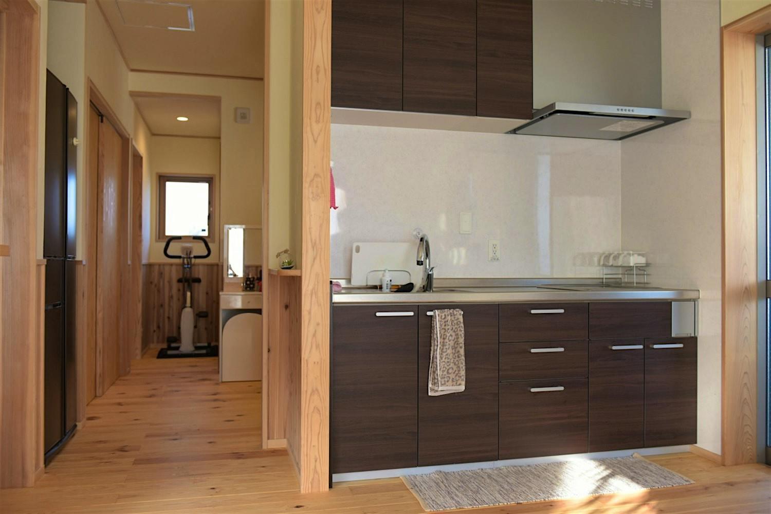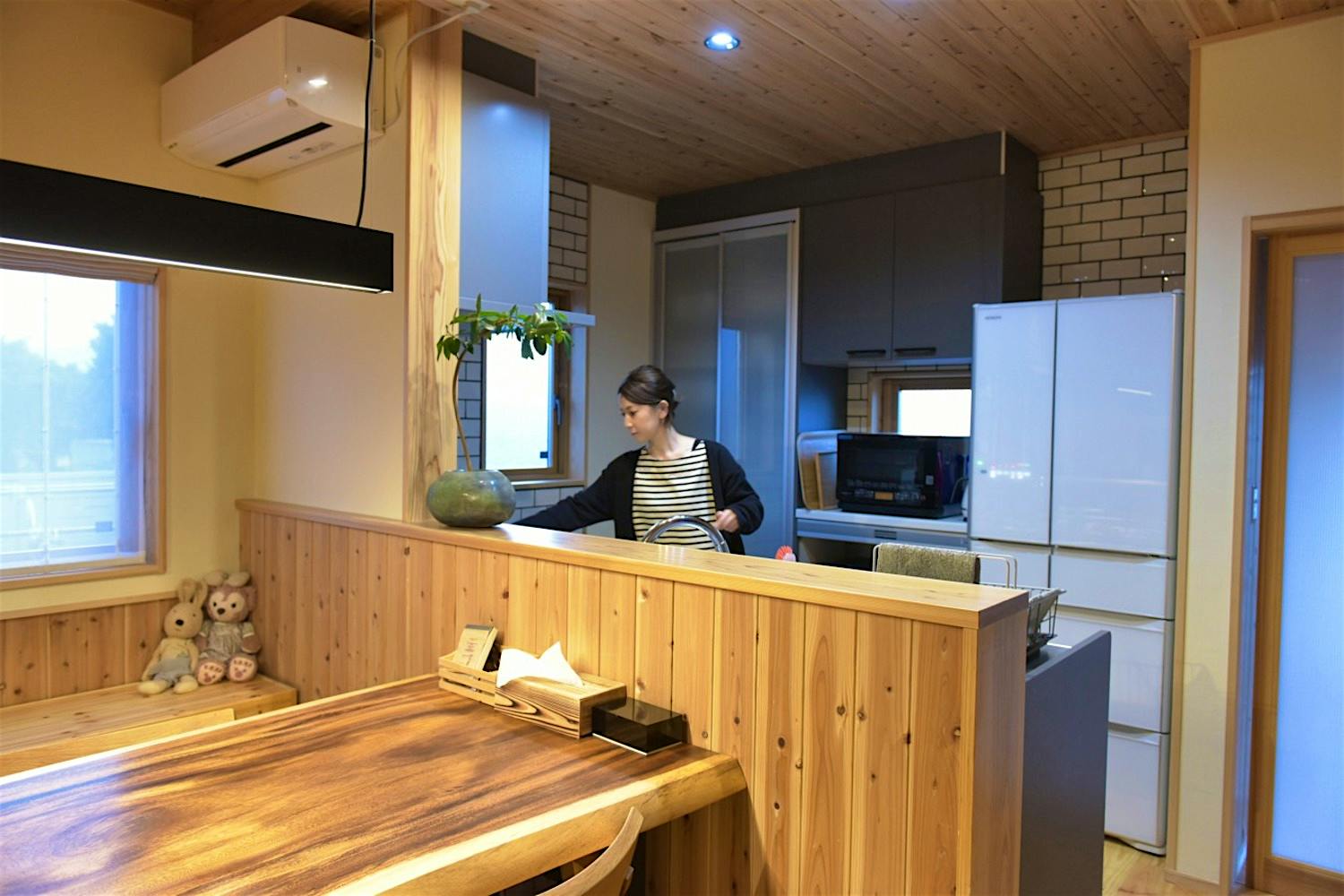 キッチンからダイニング、リビングを望む。子供たちの様子も見えて安心。