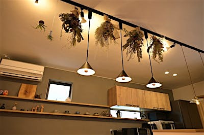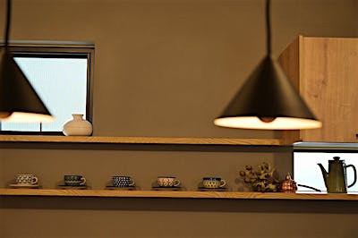キッチンダイニングの壁はグレーのアクセントウォール。大きな飾り棚に、お気に入りの小物を並べて。