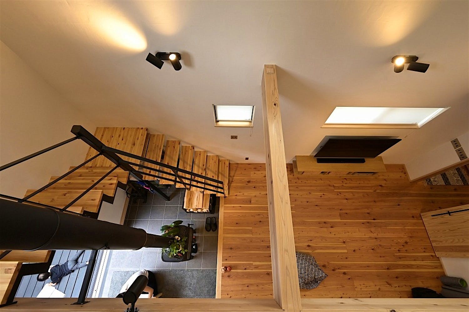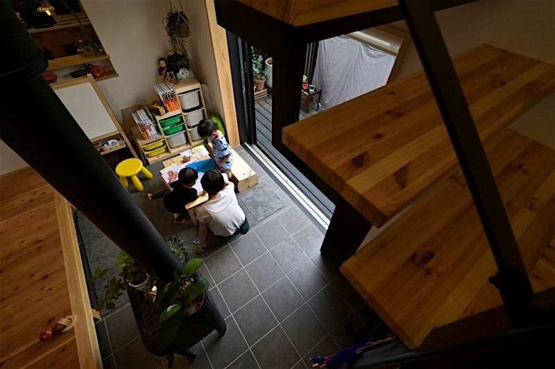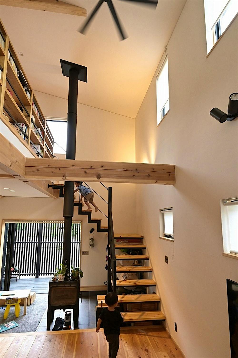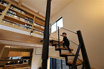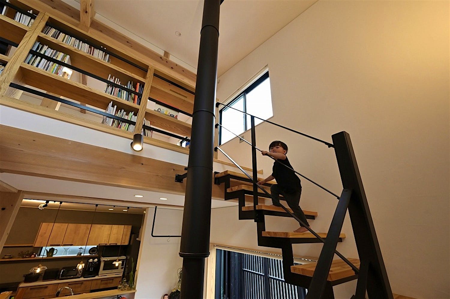 ブラックの鉄骨で組み上げたスリット階段は、インテリアのアクセントになる。小さいお子さんたちも怖がることなく、面白みある空間を楽しんでいるそう。