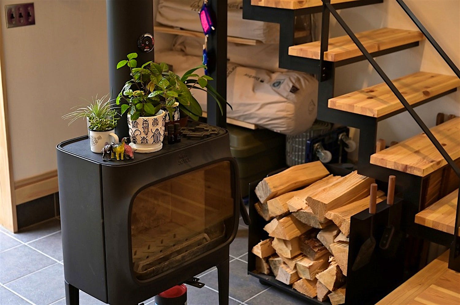 土間の中心に薪ストーブを据え、暖房効率もバツグンに良い。