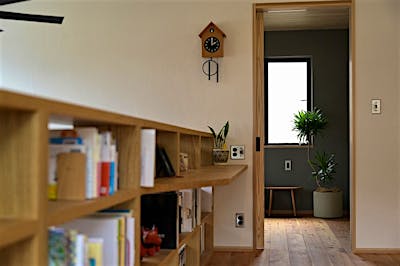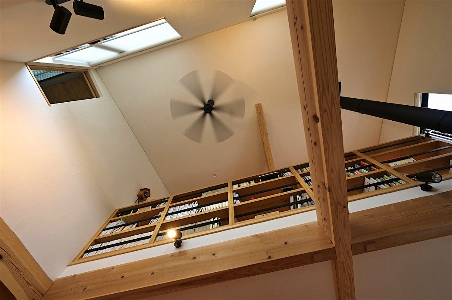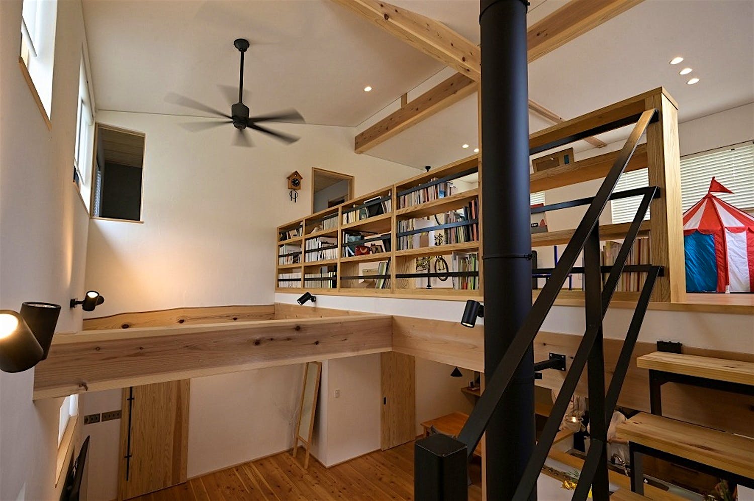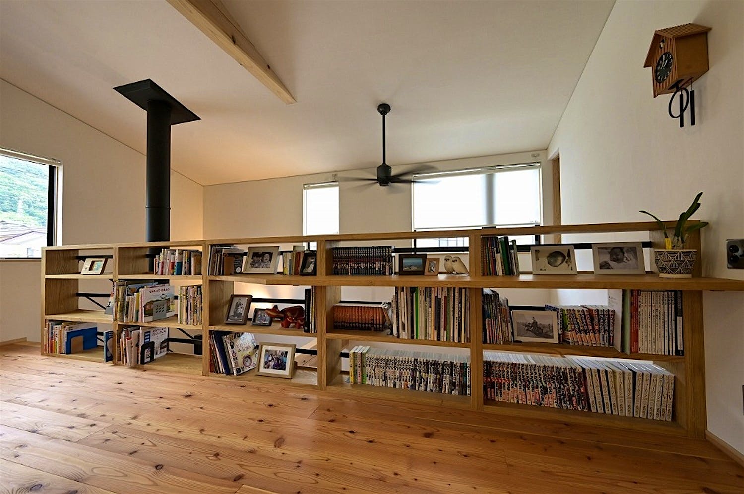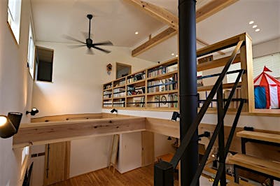 二階の共有スペースは、吹抜けに面した腰壁をオープンな本棚にした。背板をアイアンにし、目線が抜けることで、収納力と開放感を両立。