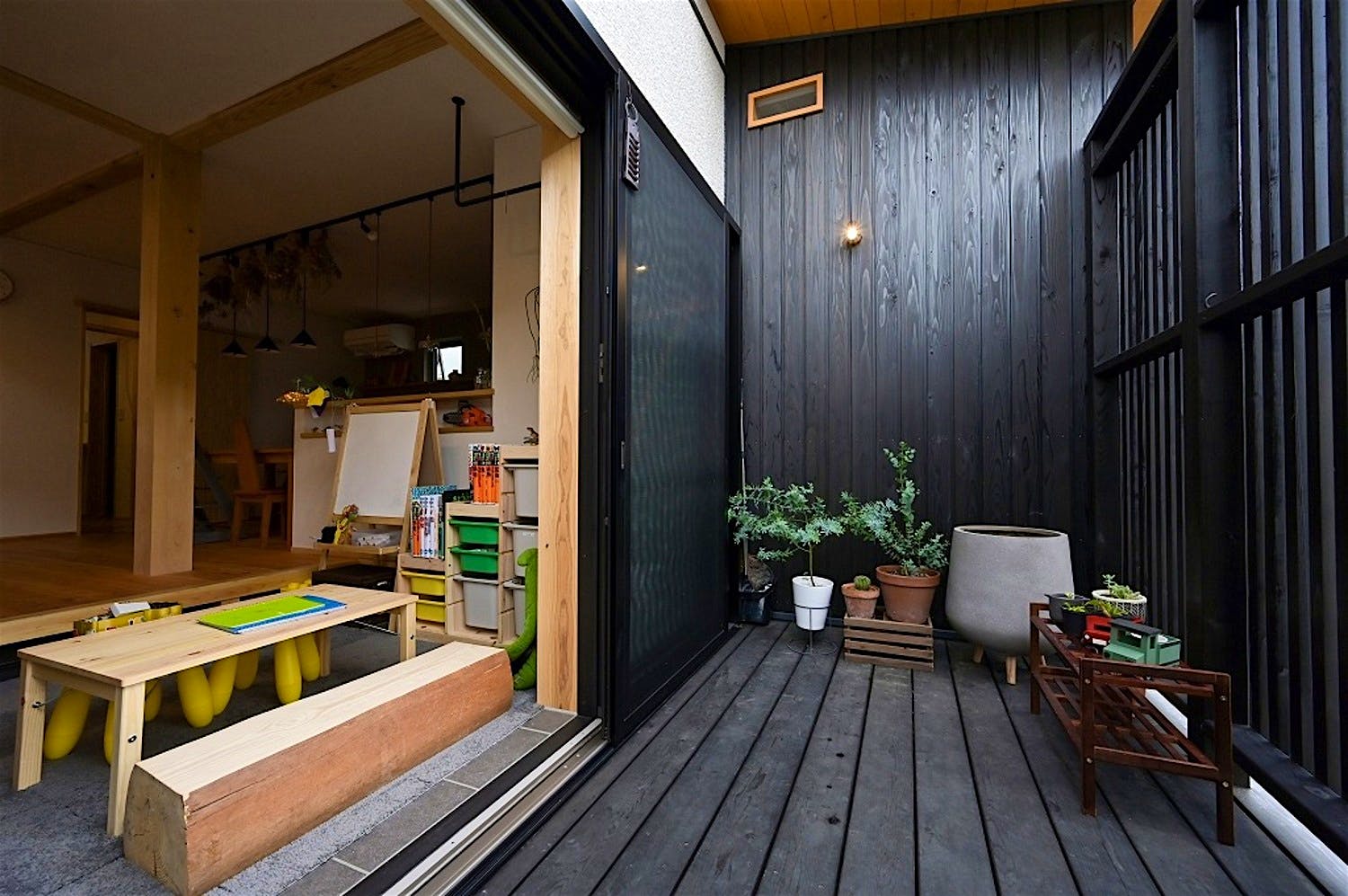 道路に面するウッドデッキは、縦格子を設けて目隠しをしつつ、風と光の通り道を確保。土間サロンの窓を開け放っても気兼ねなく過ごせる。