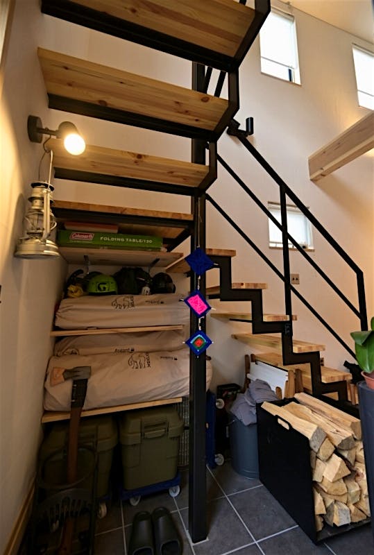 階段下はアウトドア用品や薪グッズを置けるオープンな収納空間。汚れを気にせずタフに使える。