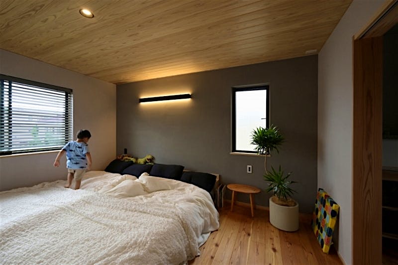 寝室もアクセントウォールと間接照明で洗練されたデザイン。