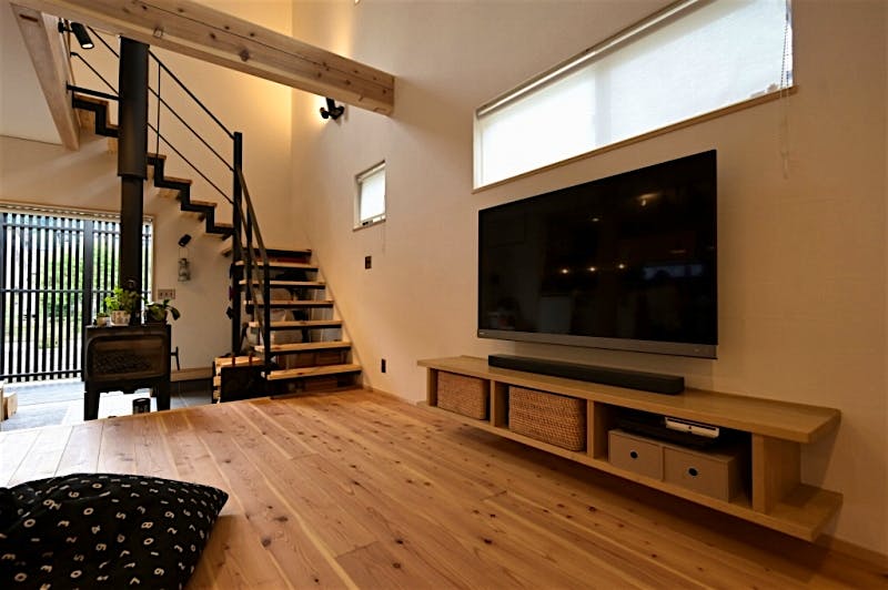 テレビは壁掛け、テレビボードは床から浮かせた造作家具で、すっきりとした空間になる。