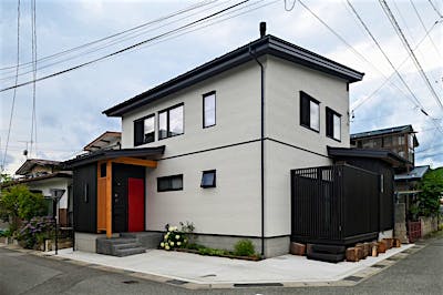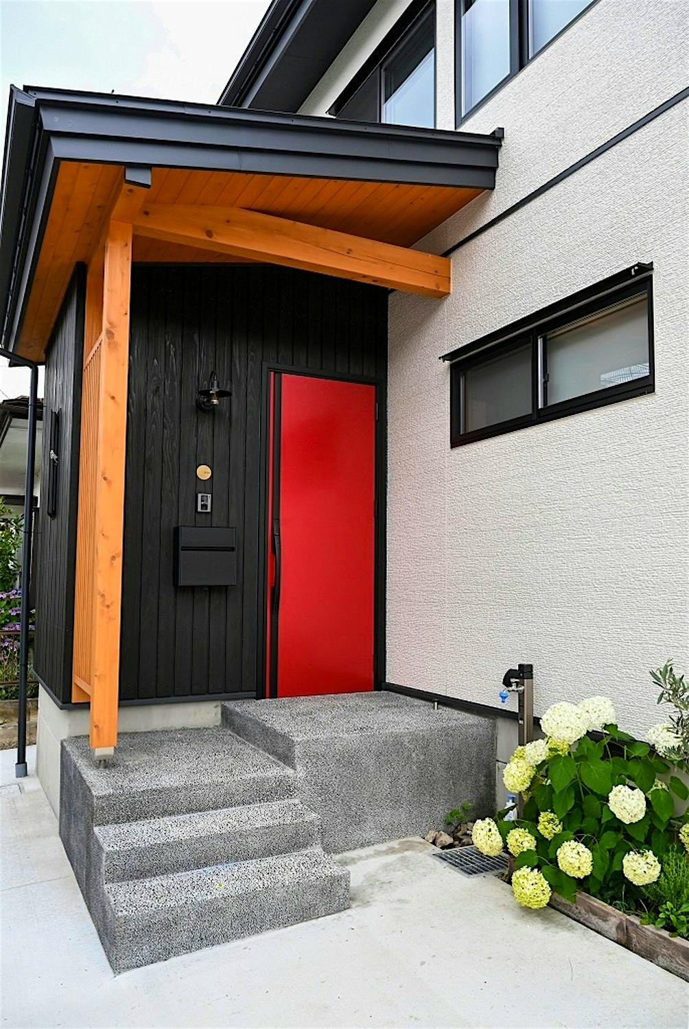モノトーンをベースにまとめた外観に、鮮やかな赤色の玄関ドアが個性的なファサード。