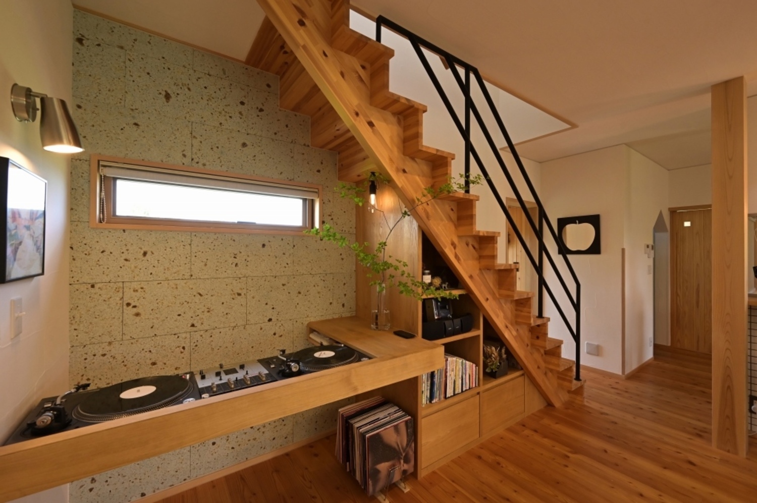 階段下スペースはご主人こだわりのDJブース!照明やアクセントウォールにもこだわった、気持ち高まる空間に。