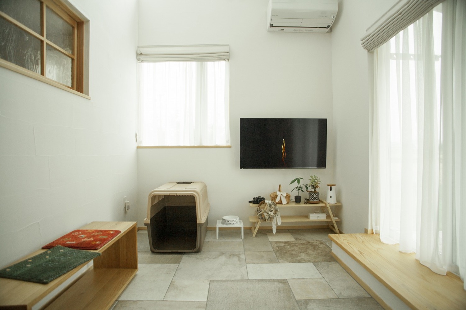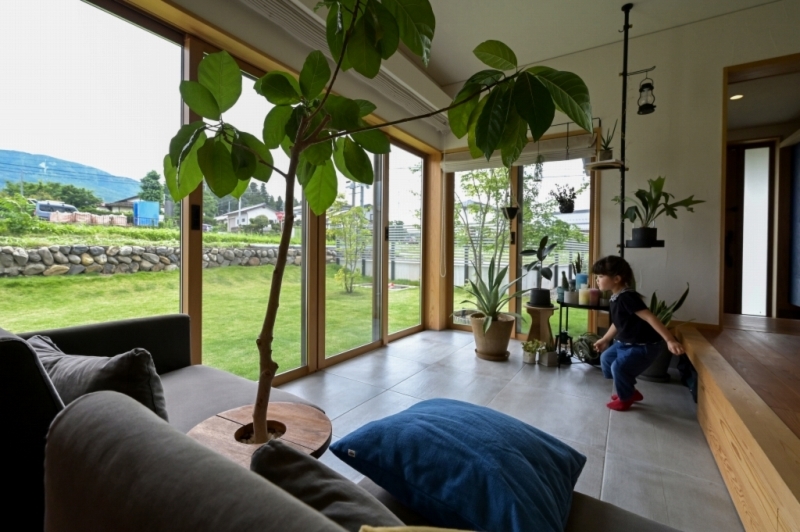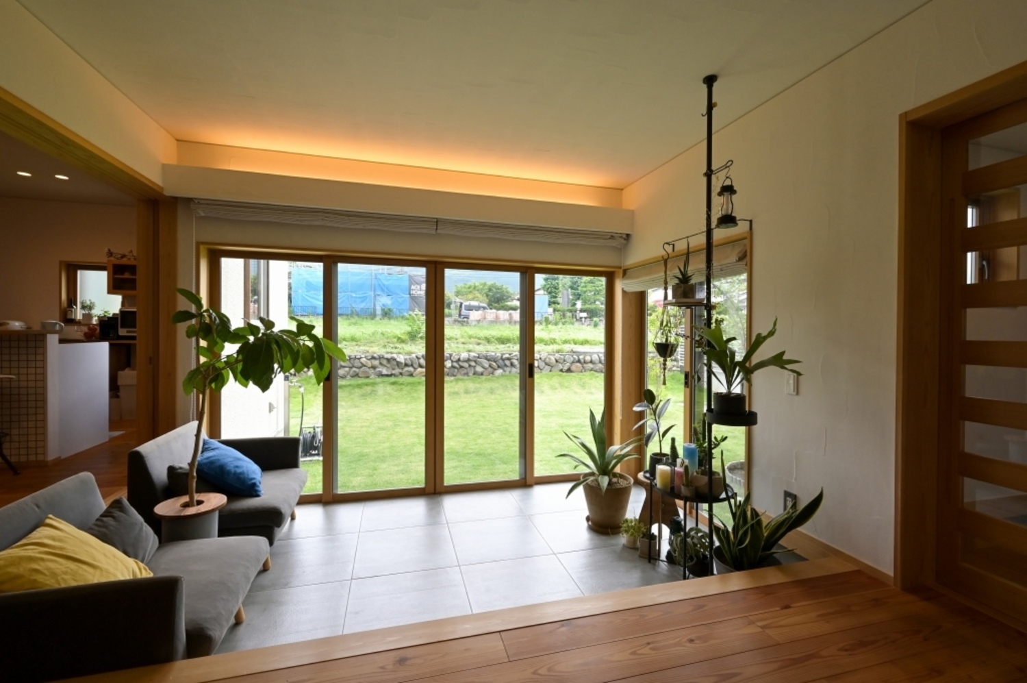 土間サロンは大きな掃き出し窓が開放的で、趣味の観葉植物にとってもバツグンの環境。間接照明のやさしい光で、くつろぎの一部屋に。