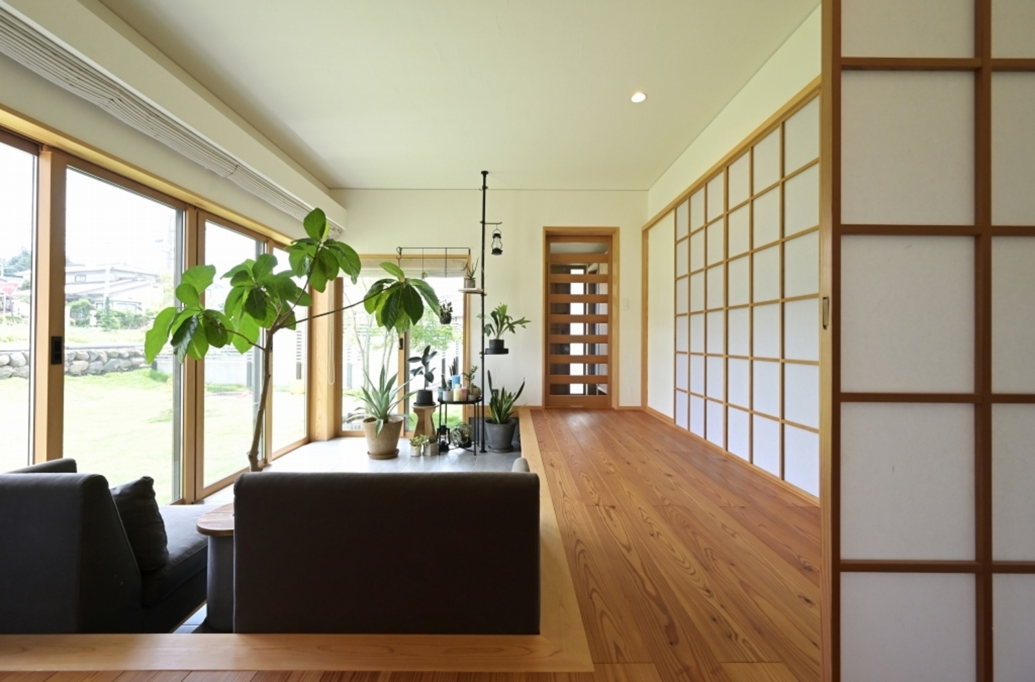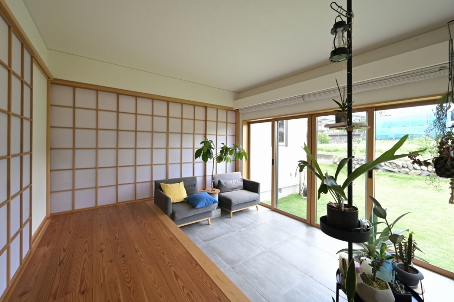親世帯・若世帯それぞれとの境界は障子で仕切ることができ、両世帯ののりしろとして、皆が集う場として、ちょうどいい距離感を育む土間サロン。