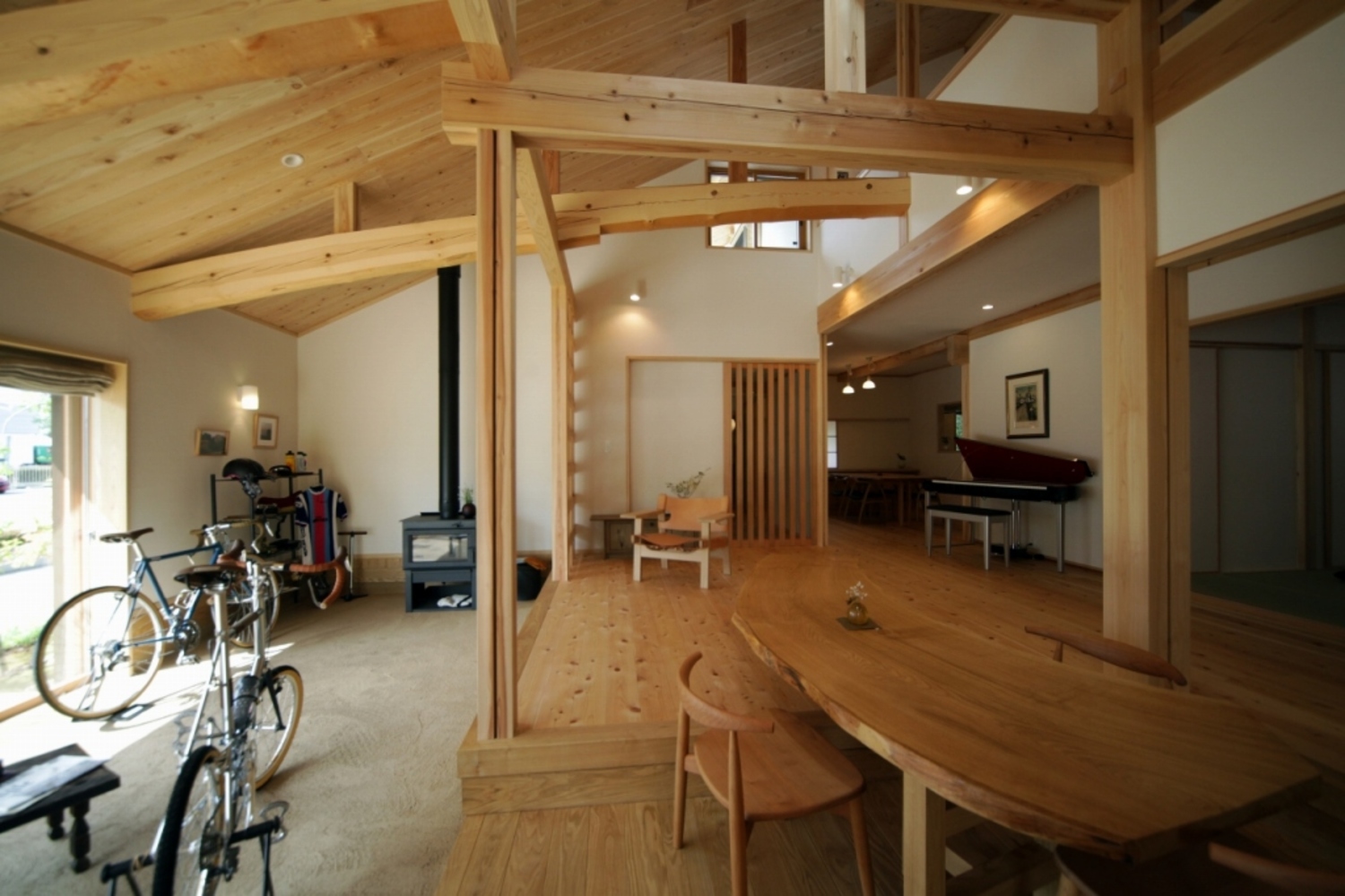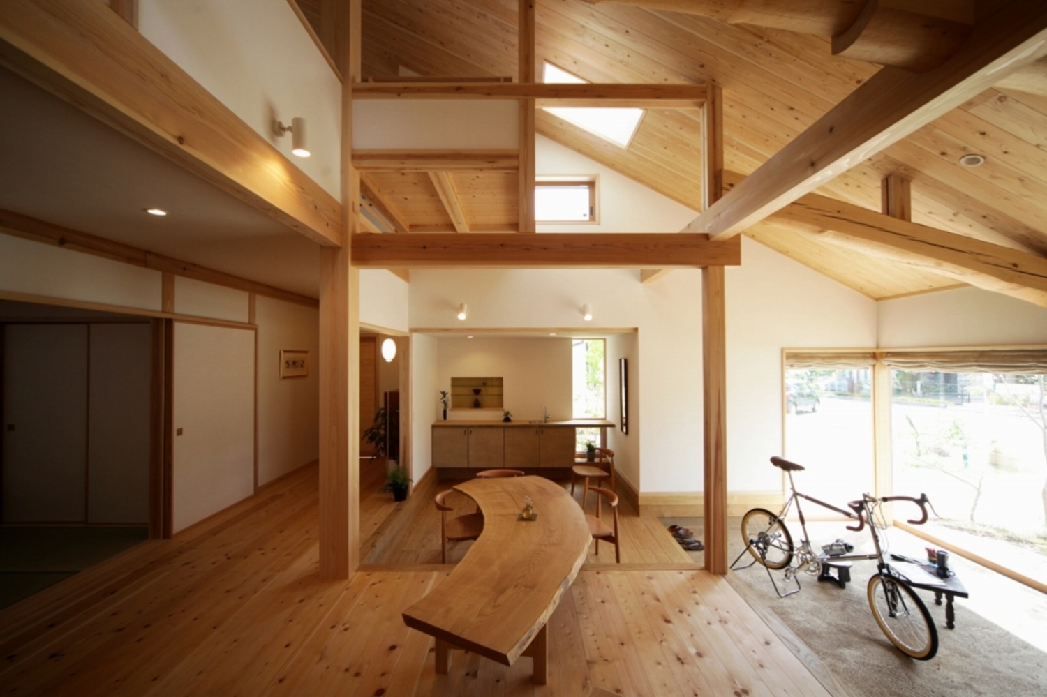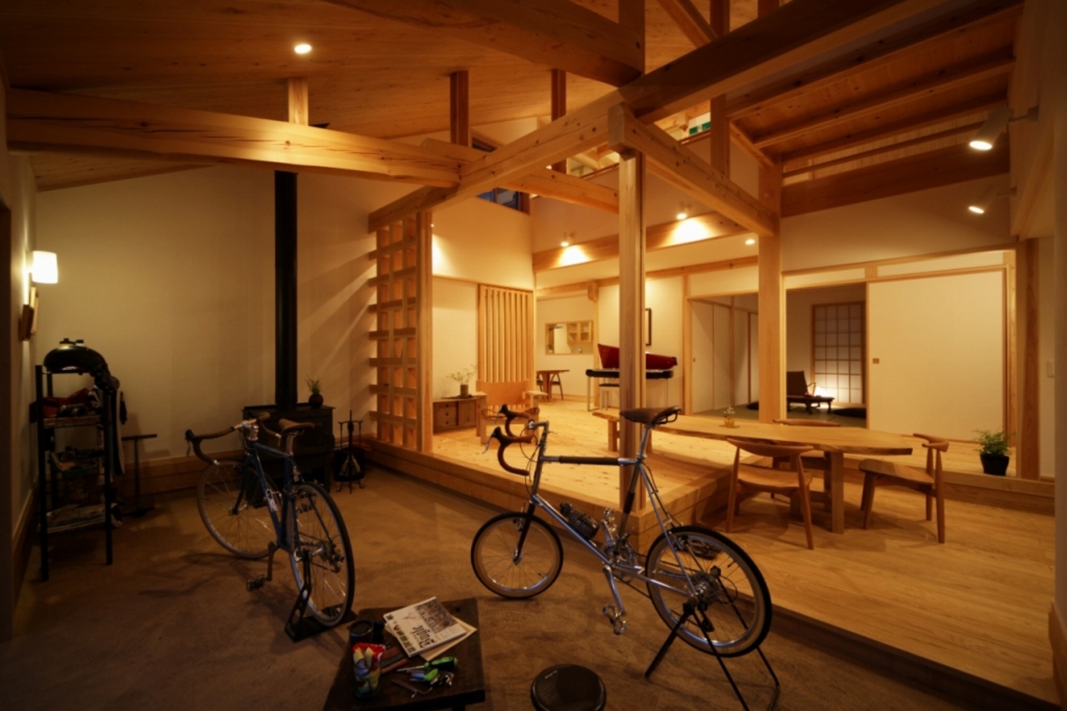 美しさ際立つ木組みの架構と、大家族にふさわしい広々とした土間サロン