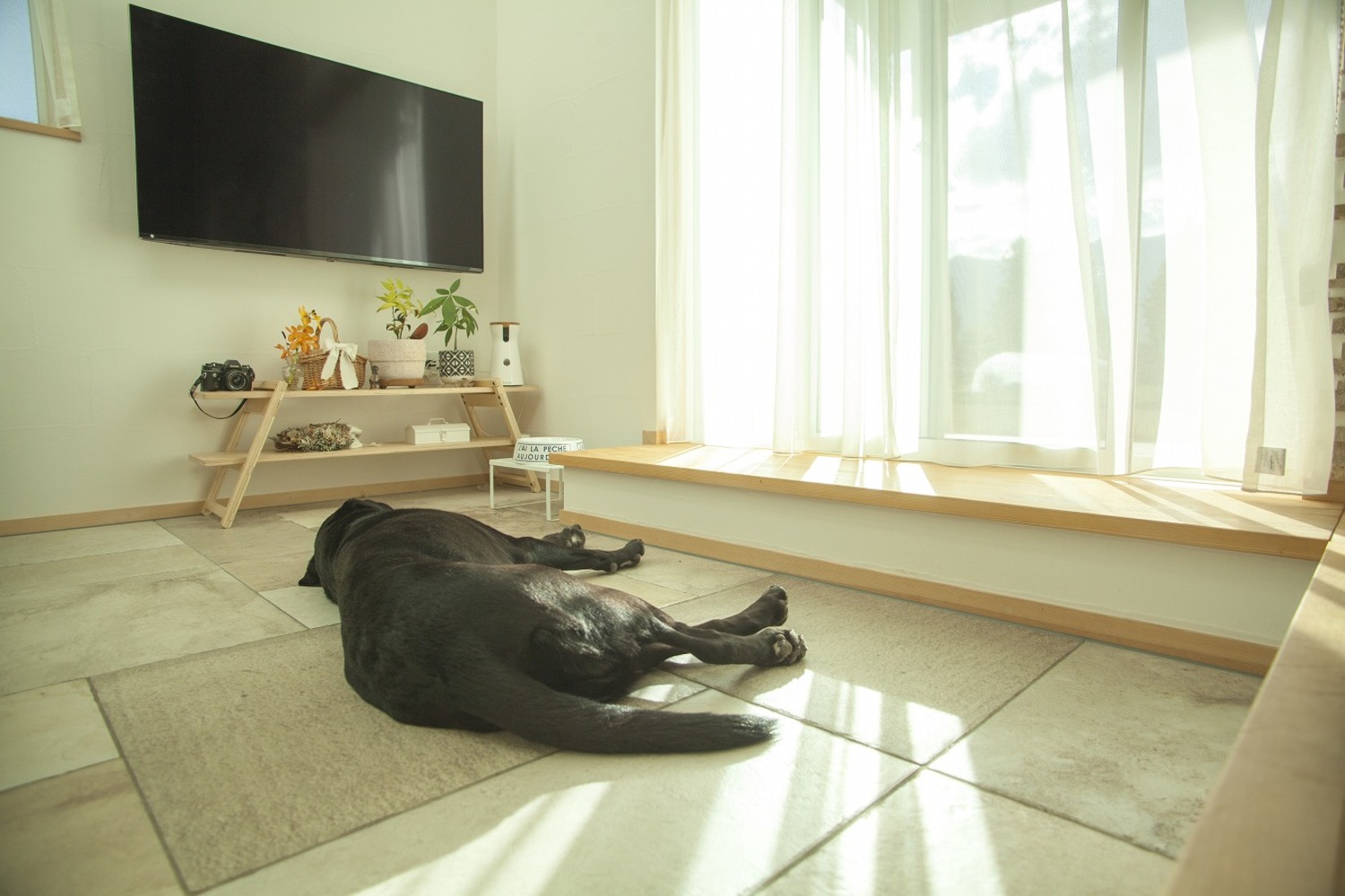 開放的なファミリースペースながらも、ブラックを差し色に空間を引き締めたインテリアコーディネート。