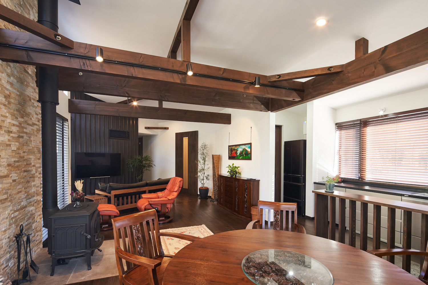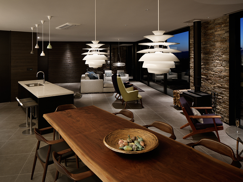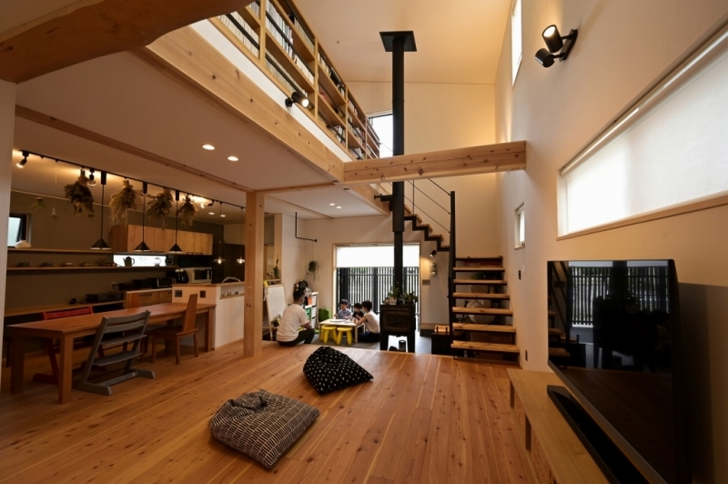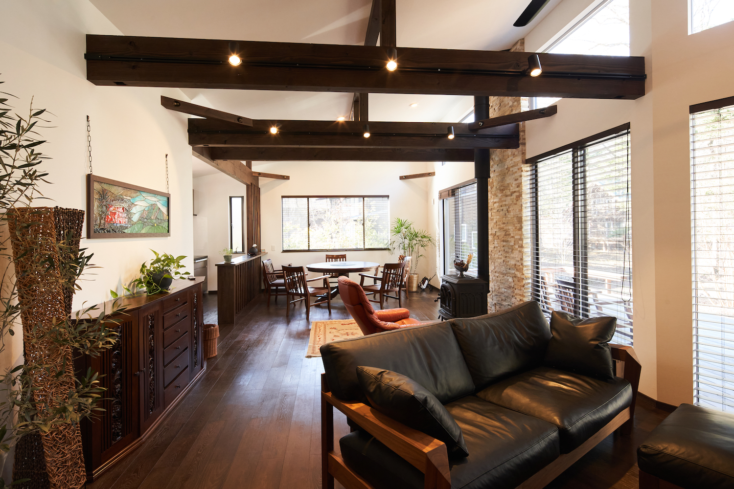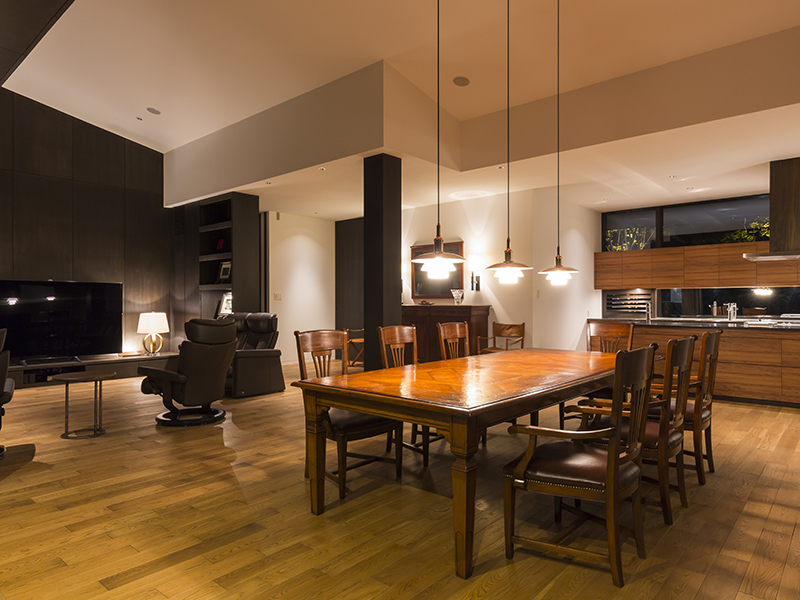 開放的なファミリースペースながらも、ブラックを差し色に空間を引き締めたインテリアコーディネート。