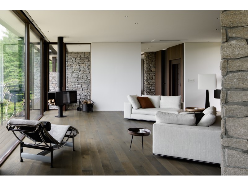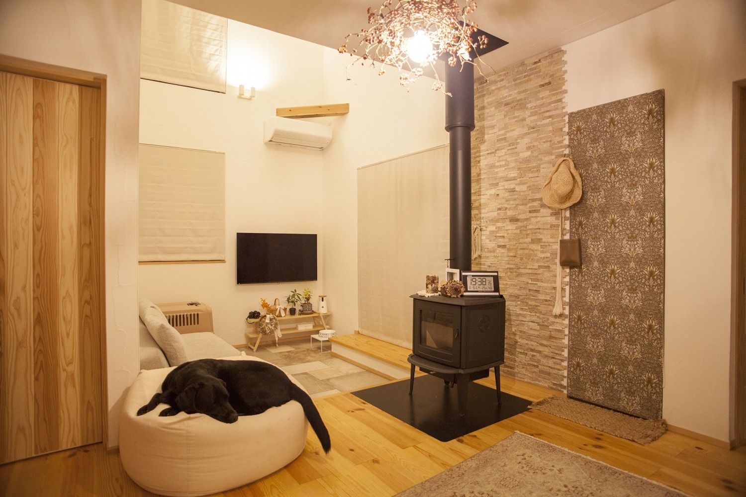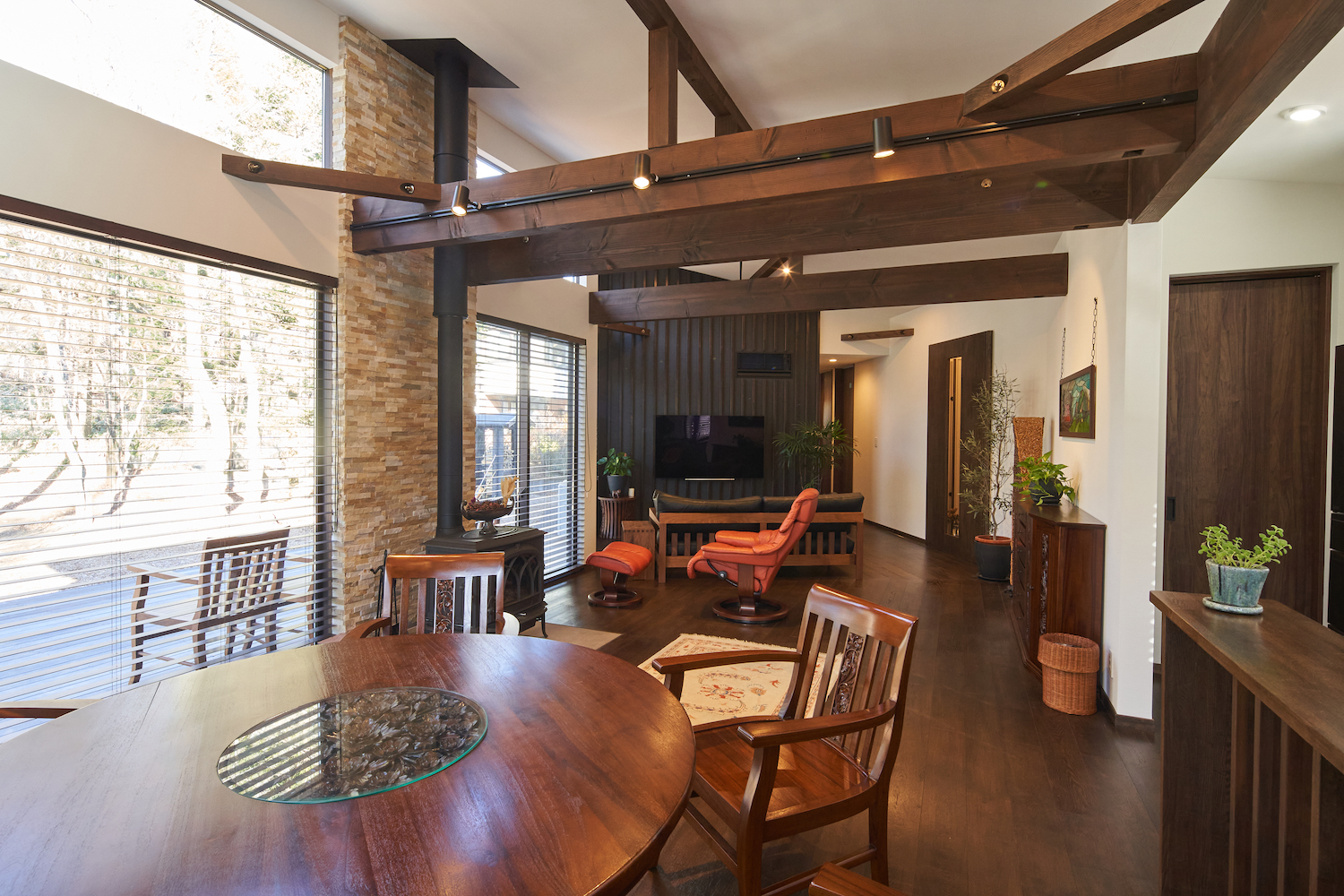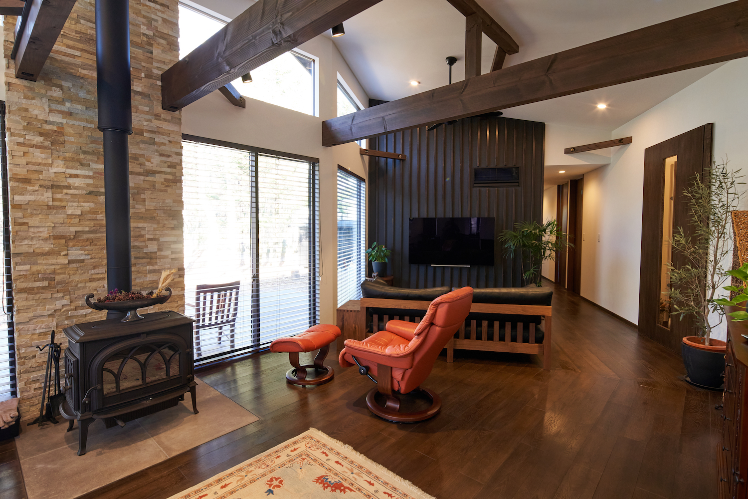 開放的なファミリースペースながらも、ブラックを差し色に空間を引き締めたインテリアコーディネート。