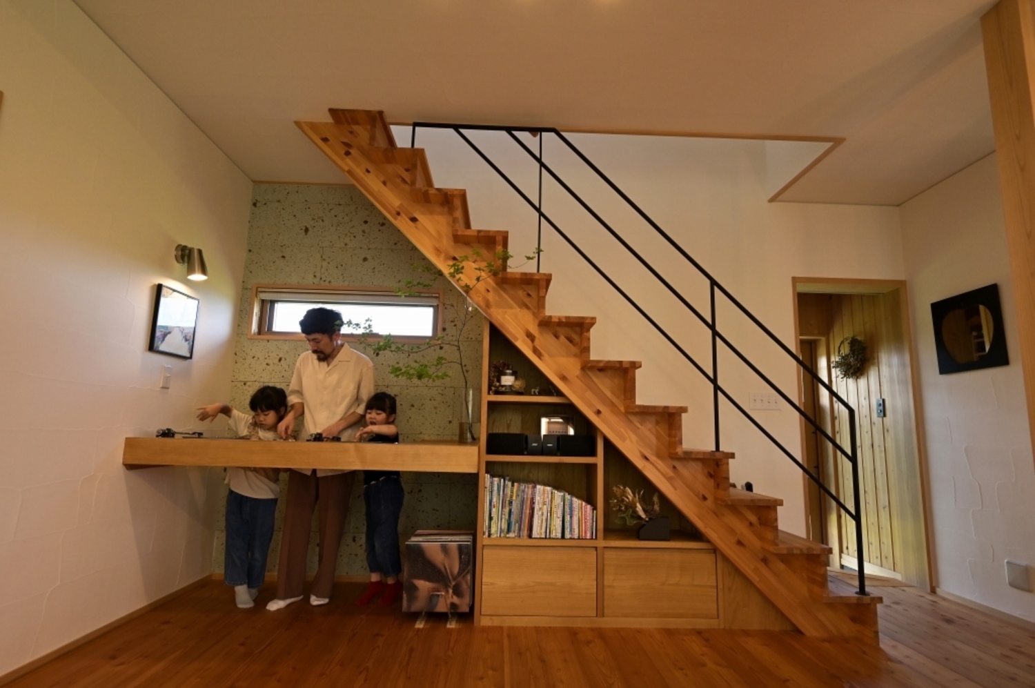 階段下スペースはご主人こだわりのDJブース!照明やアクセントウォールにもこだわった、気持ち高まる空間に。