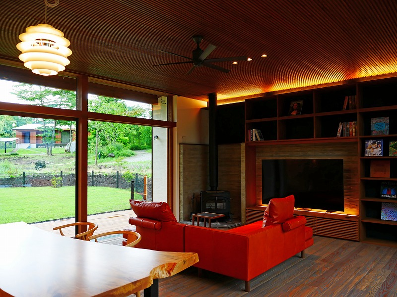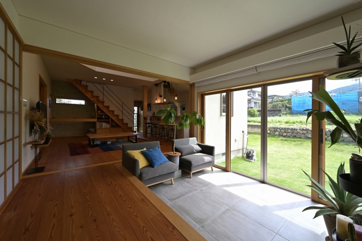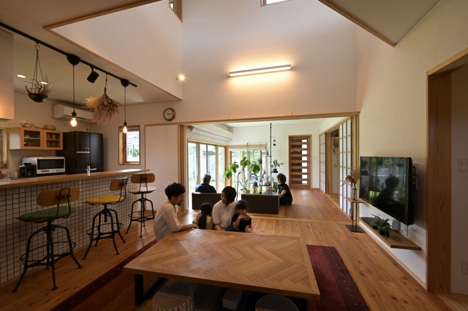 若世帯リビングの隣は、親世帯と共有の土間サロンにつながる。建具をフルオープンにすると広々とした大空間に。