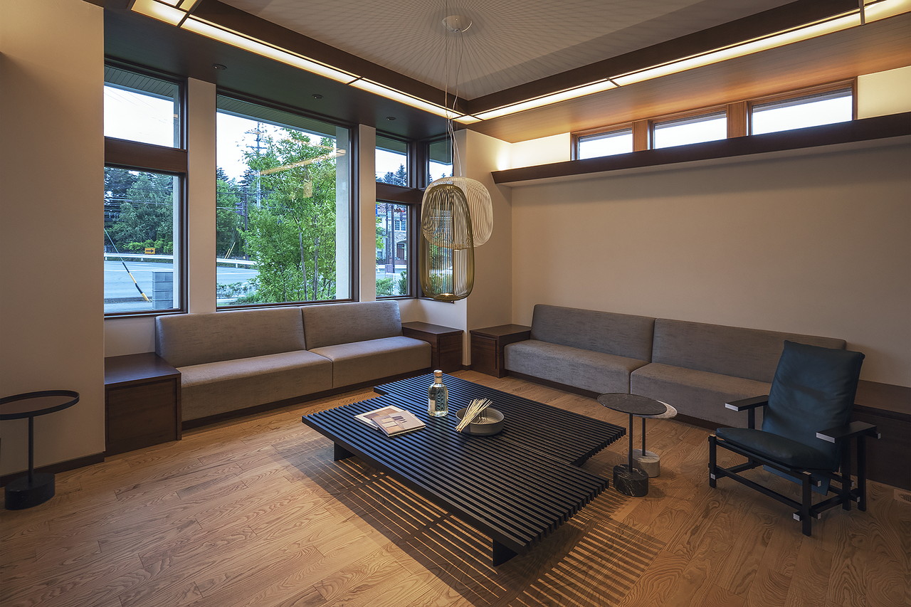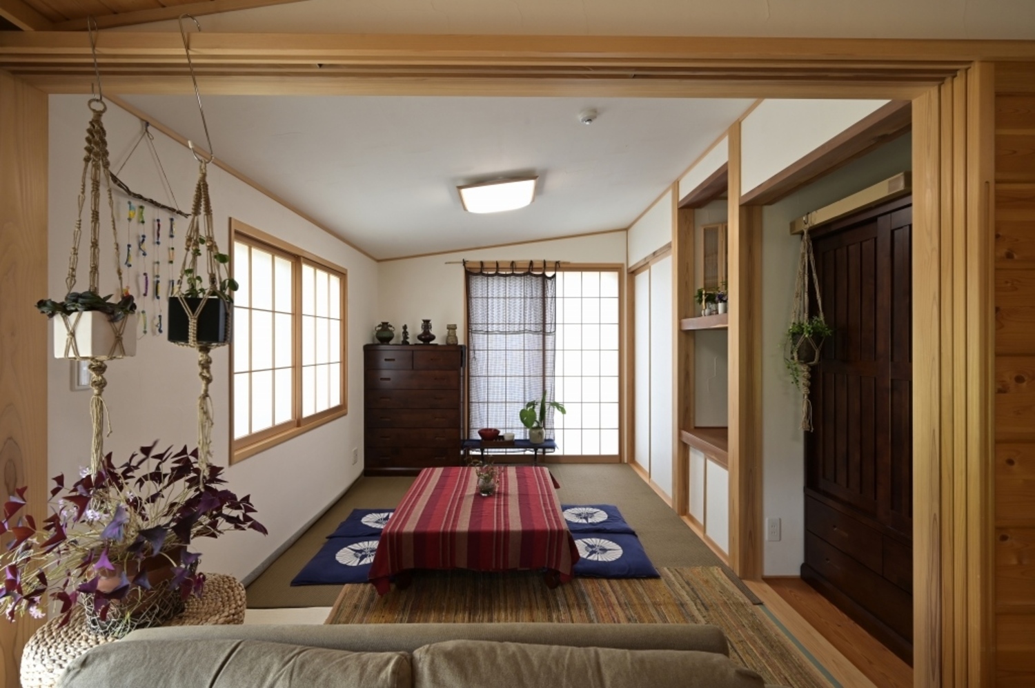 和の趣を感じる、親世帯のリビング。建て替え前の旧家から拝借した古材の欄間がアクセント。