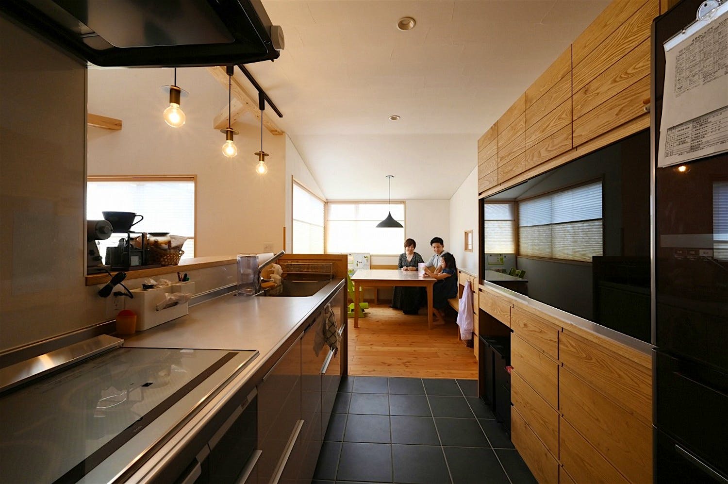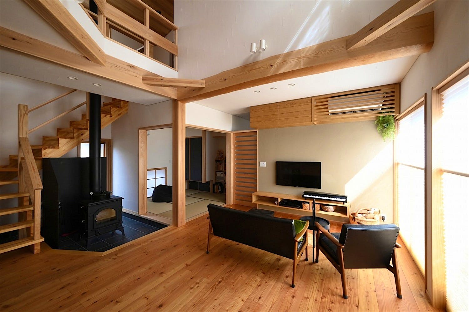 階段と絡めた北の土間サロンに、薪ストーブを据えた。家の中心に位置し、暖房効率もバツグン。