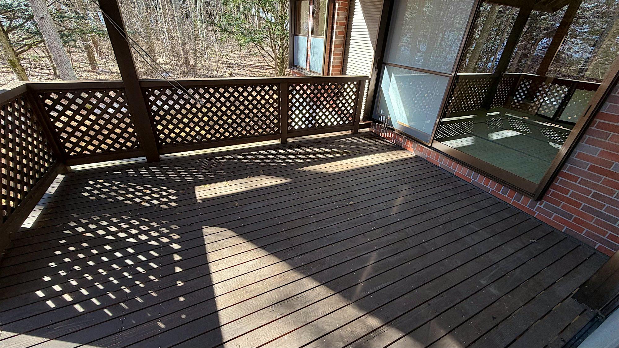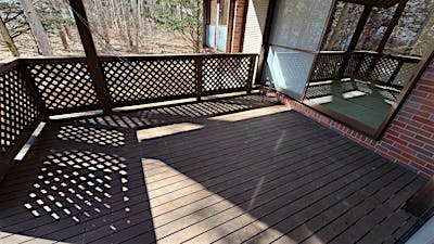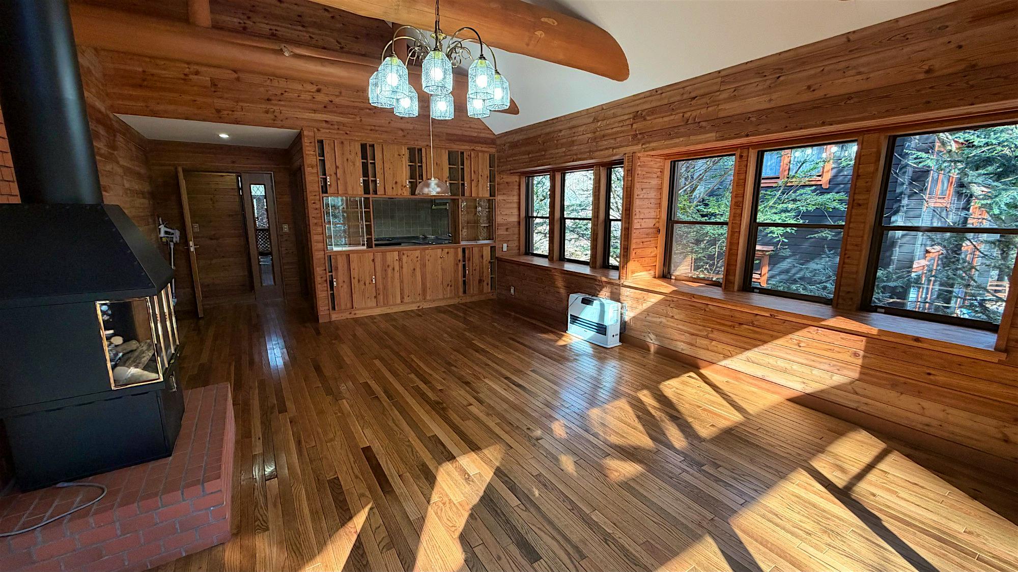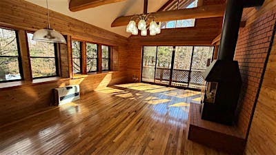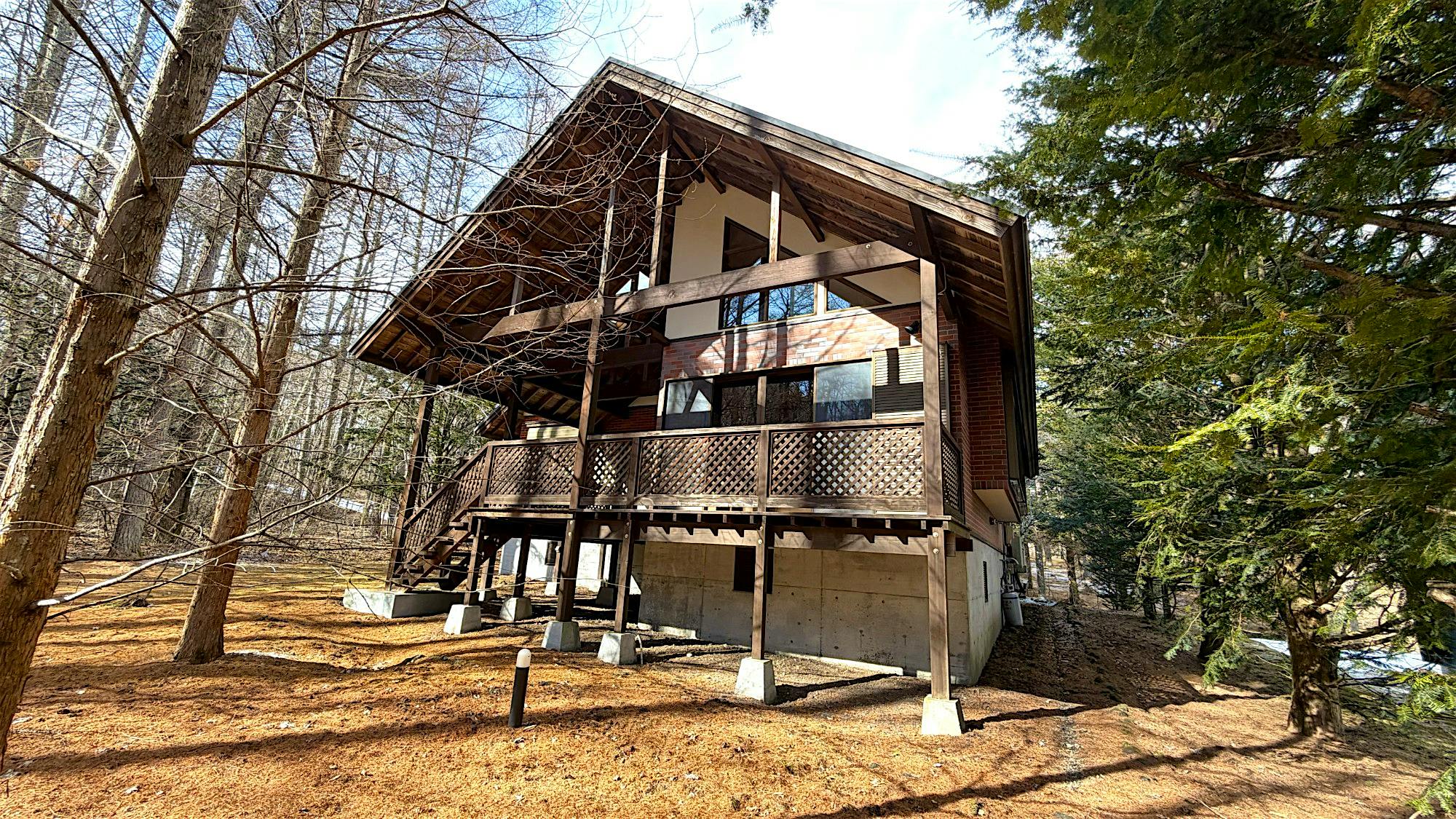 中軽井沢 千ヶ滝西区の新からまつの森エリアに位置する中古戸建。春には桜、秋にはモミジが映える前面道路から四季を感じる別荘地内。 LDKの天井には太い梁が見え、重厚感のある物件。